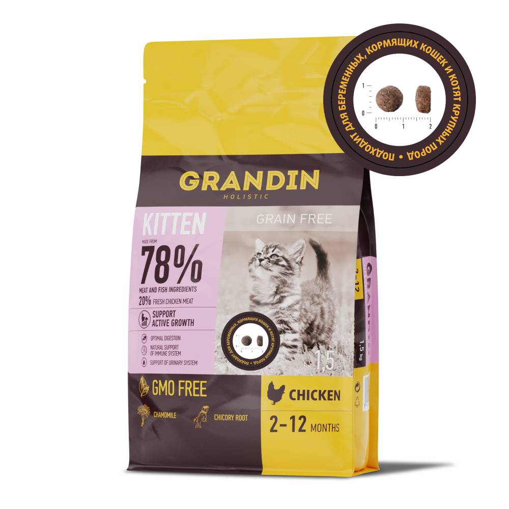 GRANDIN Holistic Kitte — это полноценный сбалансированный рацион c курицей для котят в возрасте до 12 месяцев, беременных и кормящий кошек. Корм на основе свежего мяса, содержит все необходимые макро- и микроэлементы для здорового роста и развития молодого питомца.
