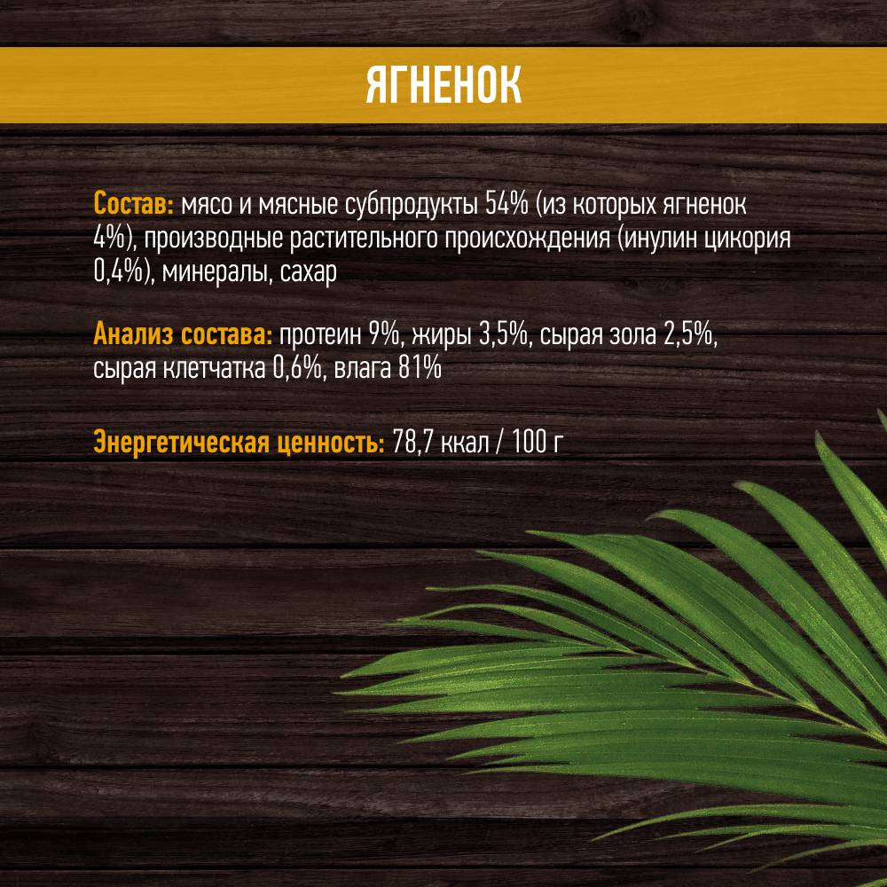 Мясо и мясные субпродукты 54% (из которых ягненок 4%), производные растительного происхождения (инулин цикория 0,4%), минералы, сахар.