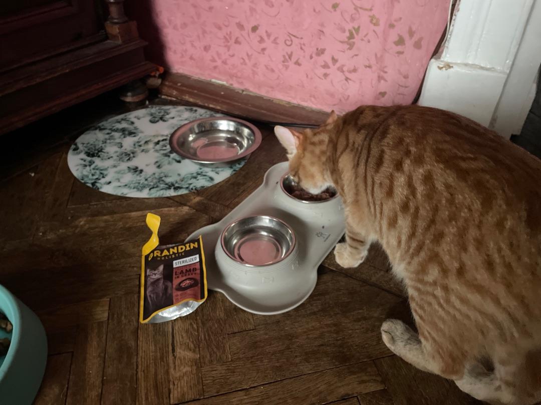 Котейка трескает, за уши не оттянуть. Еще и пытается лапой потянуть поближе миску, пока накладываю.