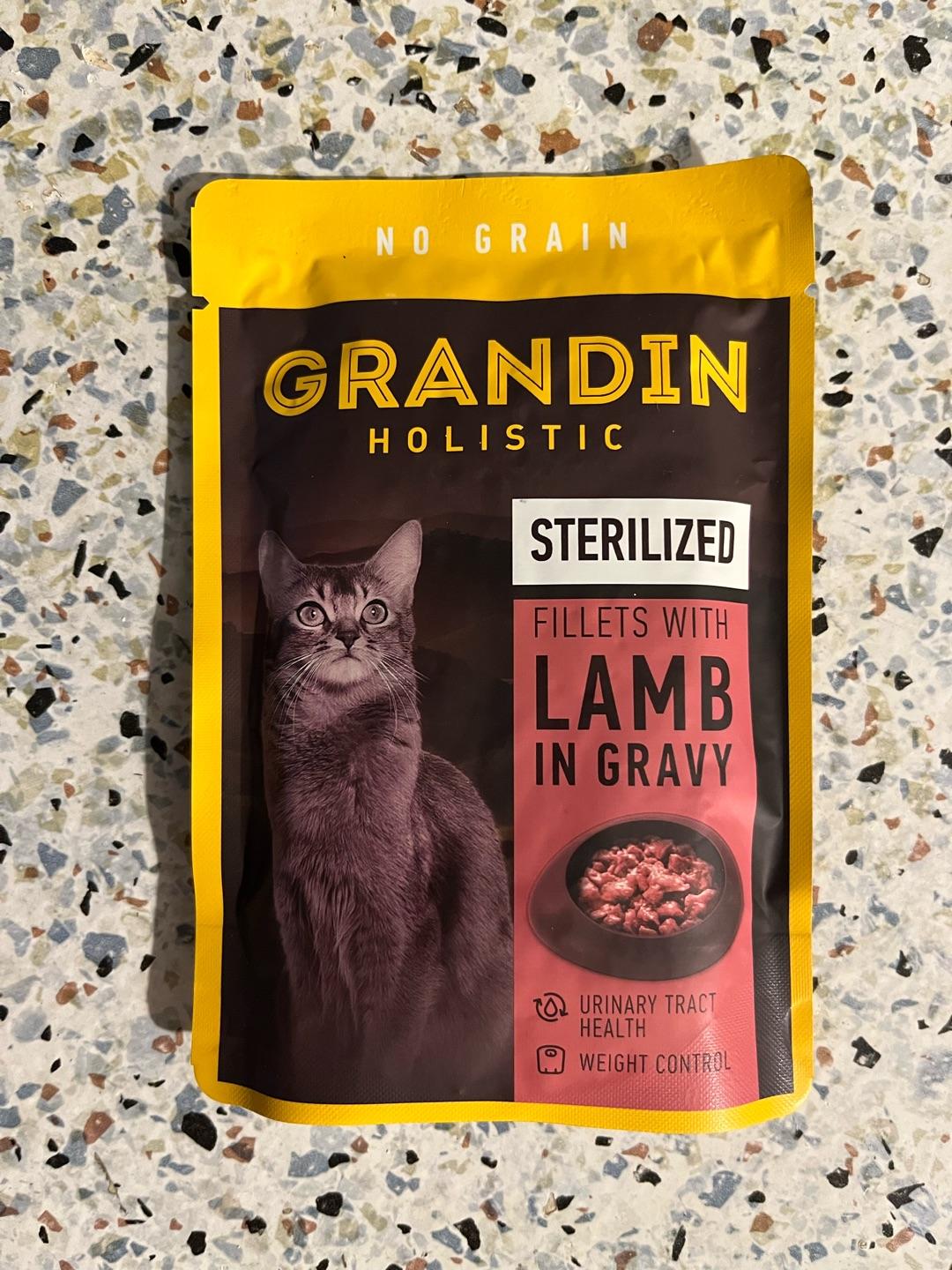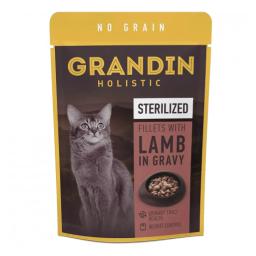 Grandin Влажный корм для стерилизованных кошек, кусочки с ягненком в соусе без злаков, 85 гр.