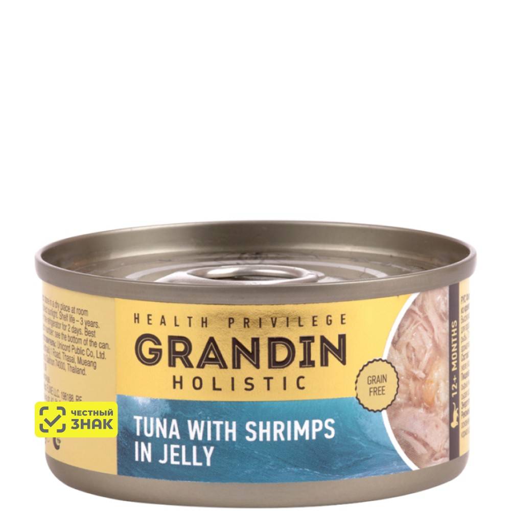 GRANDIN Holistic Health Privilege Тунец с топпингом из креветок в желе — высококачественный консервированный корм для взрослых кошек с повышенным содержанием рыбы.