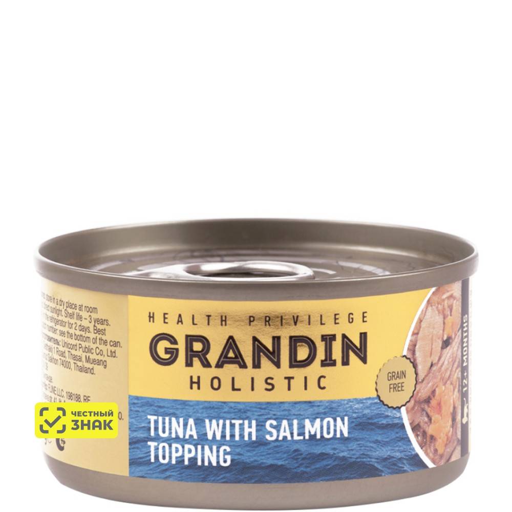 GRANDIN Holistic Health Privilege Тунец с топпингом из лосося - высококачественный консервированный корм для взрослых кошек с повышенным содержанием рыбы.