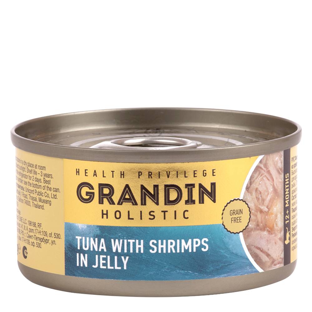 GRANDIN Филе тунца с топпингом из креветок в желе — высококачественный консервированный корм для взрослых кошек с повышенным содержанием рыбы.