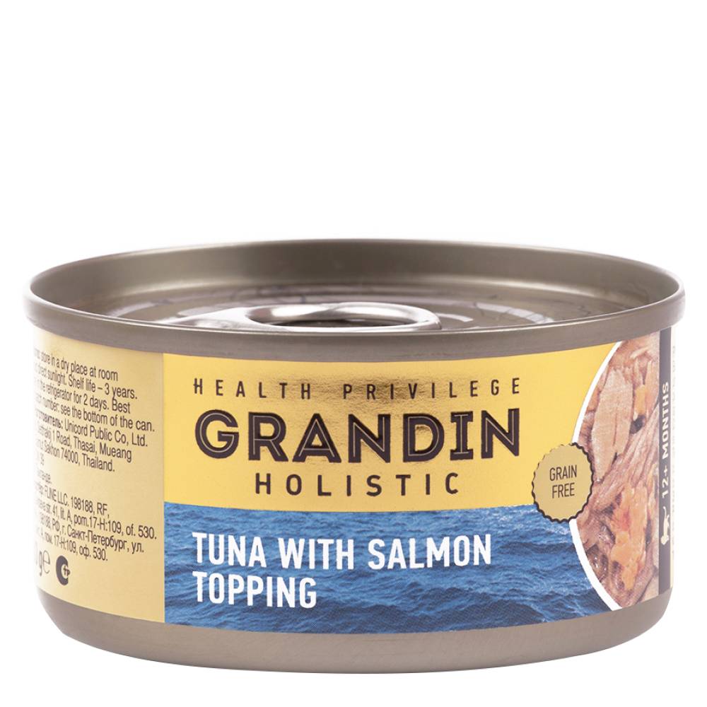 GRANDIN Филе тунца с топпингом из лосося — высококачественный консервированный корм для взрослых кошек с повышенным содержанием рыбы.