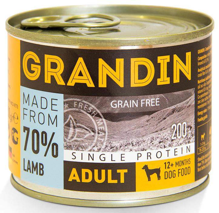 GRANDIN консервированный корм для собак всех пород и возрастов на основе мяса ягненка. Монобелковый корм идеально подойдет для основы рациона питания питомцев, склонных к аллергии и пищевой непереносимости традиционно самых популярных источников белка, используемых в кормах для собак (курицы, свинины и прочих видах мяса).