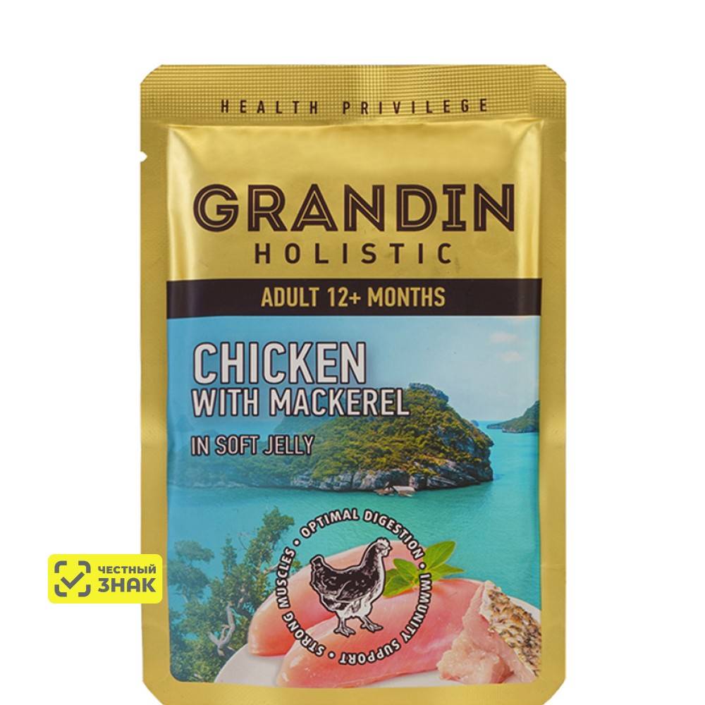 Grandin Holistic Health Privilege - вкусный дополнительный рацион для взрослых кошек. Корм изготовлен из свежего мяса курицы и макрели с добавлением аппетитного нежного желе, которое придает корму превосходный вкус.