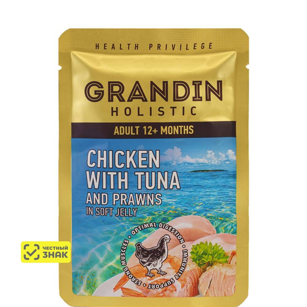 Grandin Holistic Health Privilege – вкусный дополнительный рацион для взрослых кошек. Корм изготовлен из свежего мяса тунца, курицы и креветок с добавлением аппетитного нежного желе, которое придает корму превосходный вкус.