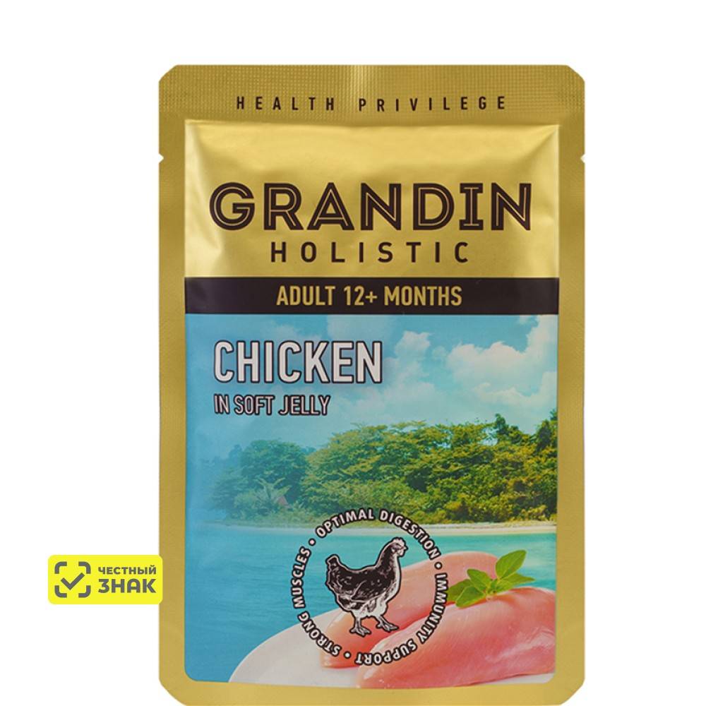 Grandin Holistic Health Privilege - вкусный дополнительный рацион для взрослых кошек. Корм изготовлен из свежего мяса курицы с добавлением аппетитного нежного желе, которое придает корму превосходный вкус.
