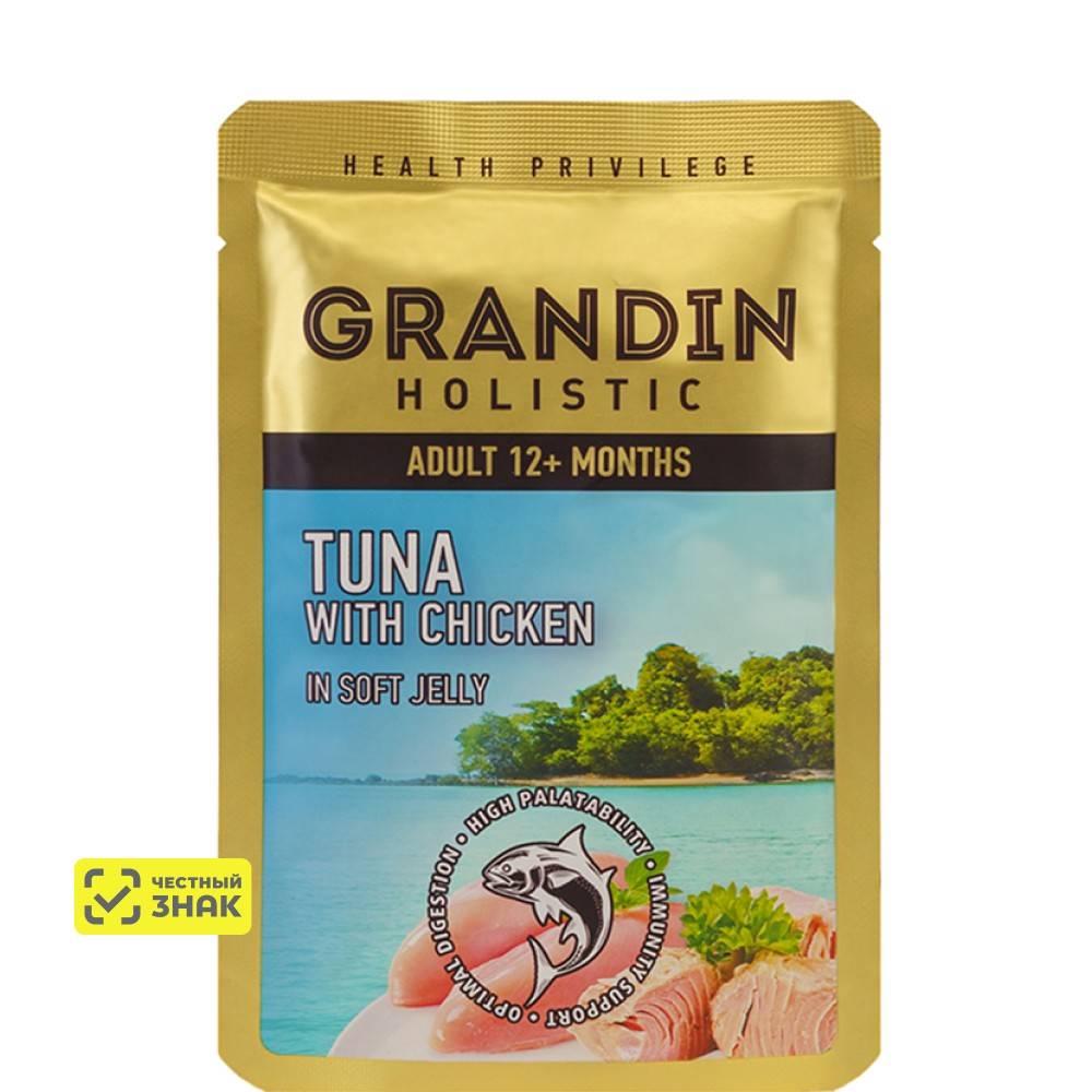 Grandin Holistic Health Privilege - вкусный дополнительный рацион для взрослых кошек. Корм изготовлен из свежего мяса тунца и курицы с добавлением аппетитного нежного желе, которое придает корму превосходный вкус.
