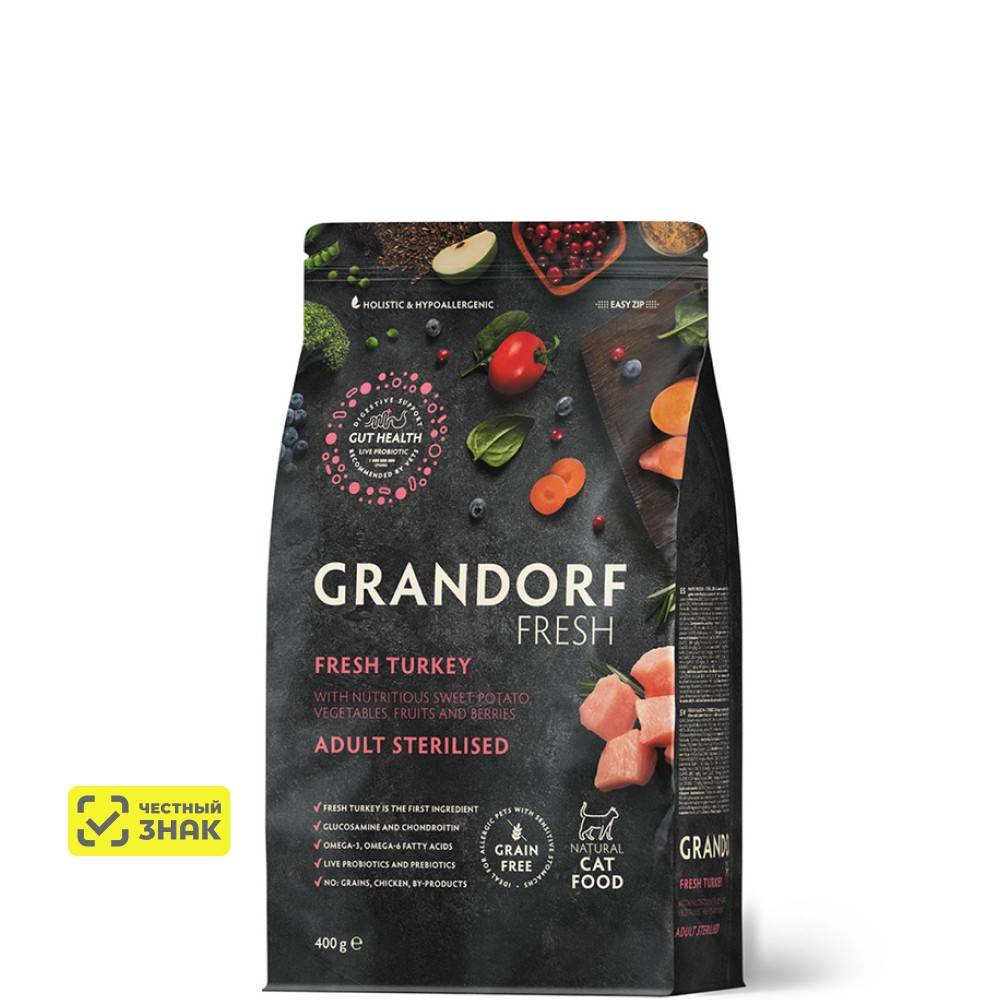 GRANDORF Fresh Adult Sterilised Сухой корм для взрослых стерилизованных кошек и кастрированных котов, с индейкой и бататом, 400 гр.
