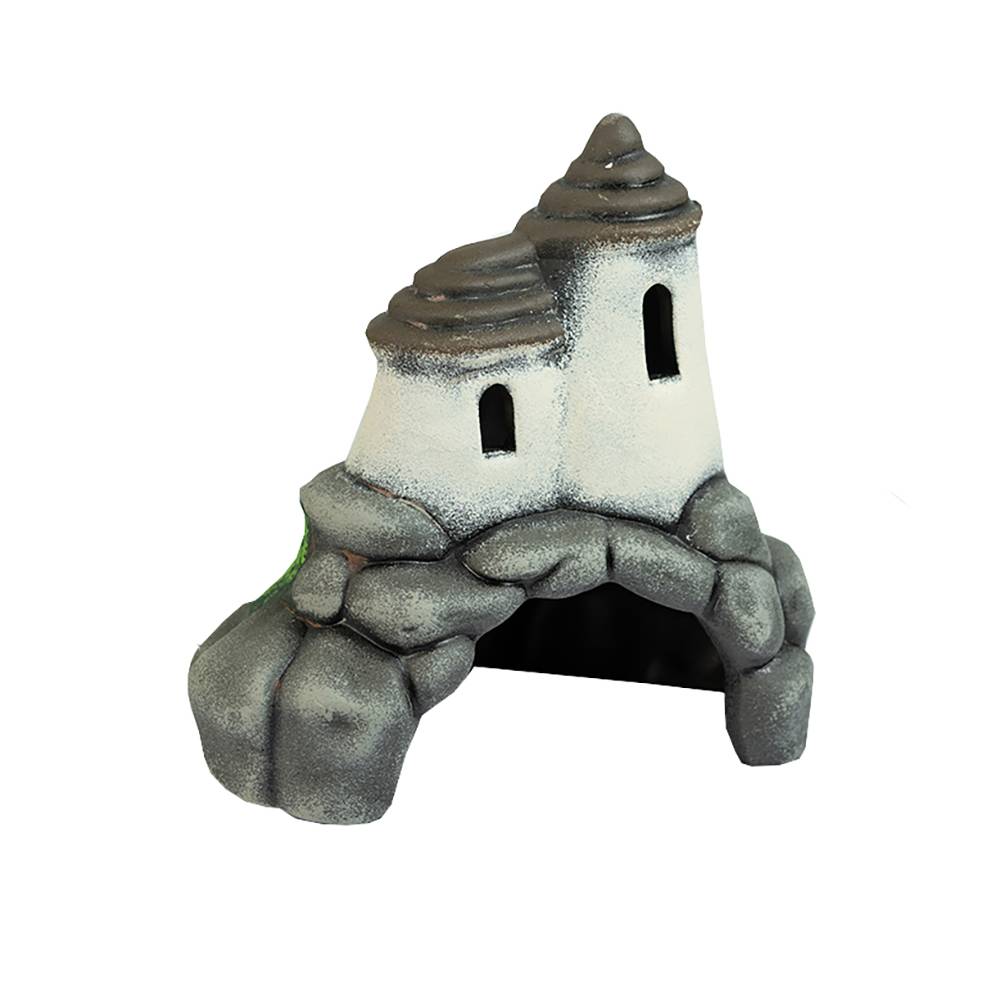 - Грот в форме замка подойдёт для аквариума любого размера.