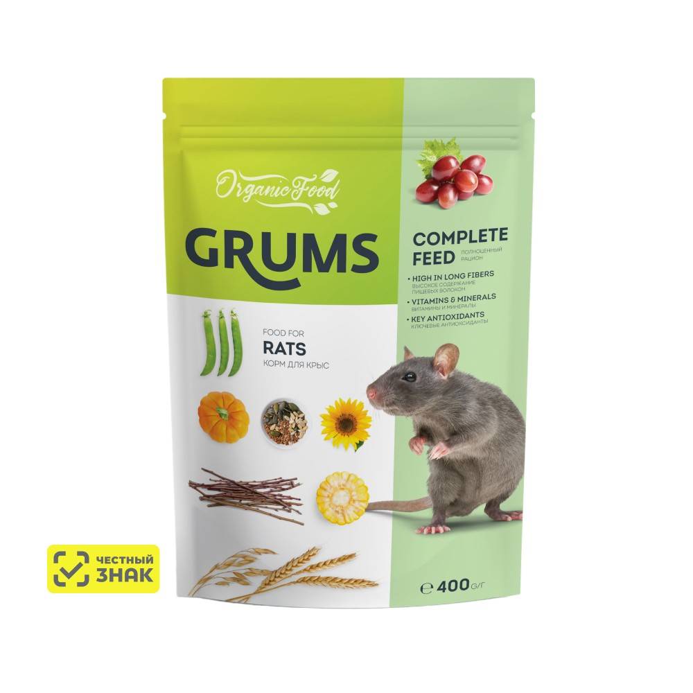 Корм GRUMS содержит различные компоненты для разнообразного питания крыс. Зерновая смесь насыщена витаминами и микроэлементами, которые гарантируют питомцам здоровье, блестящую шерсть, оптимальное пищеварение, крепкие зубы и скелет.