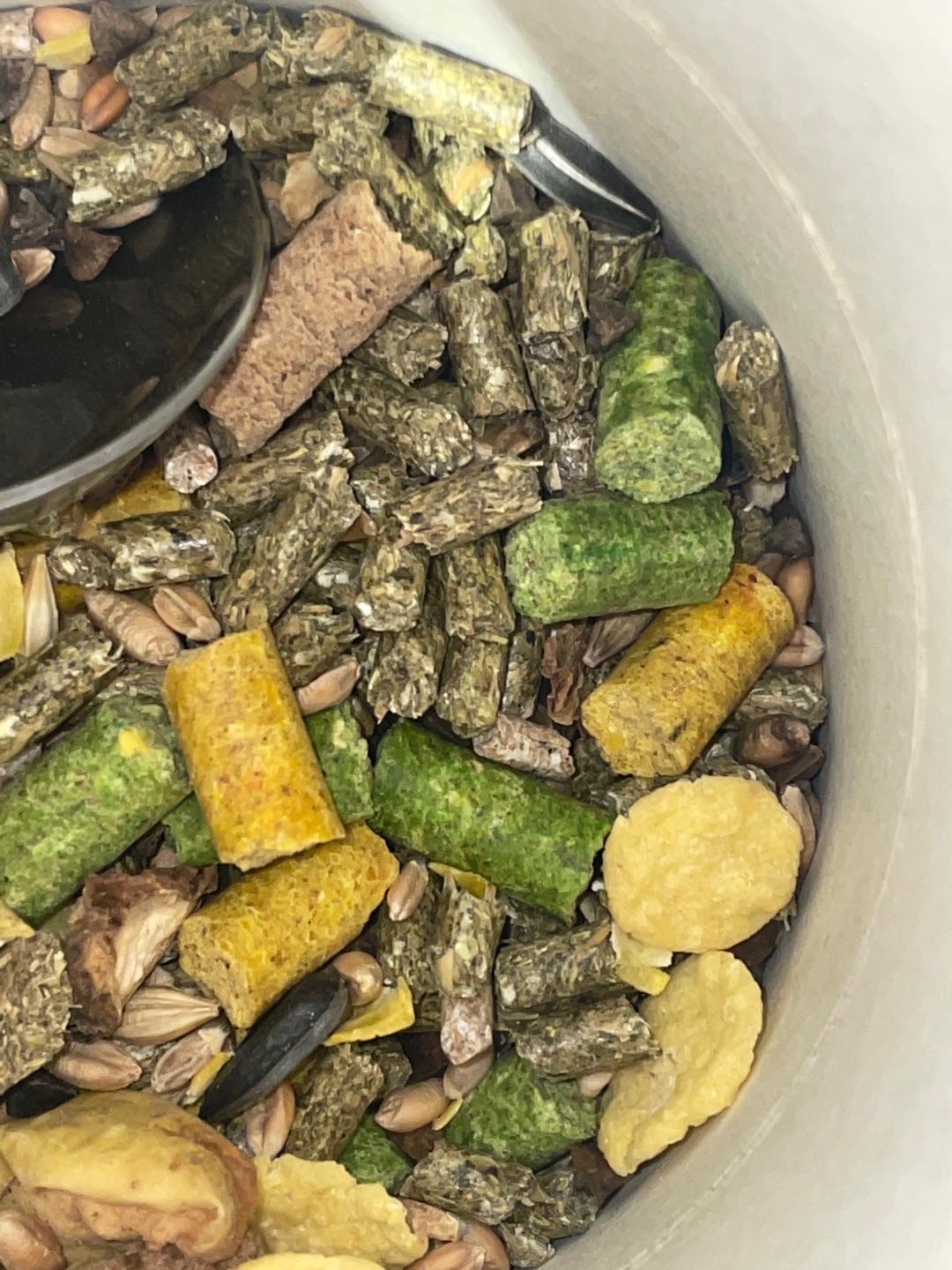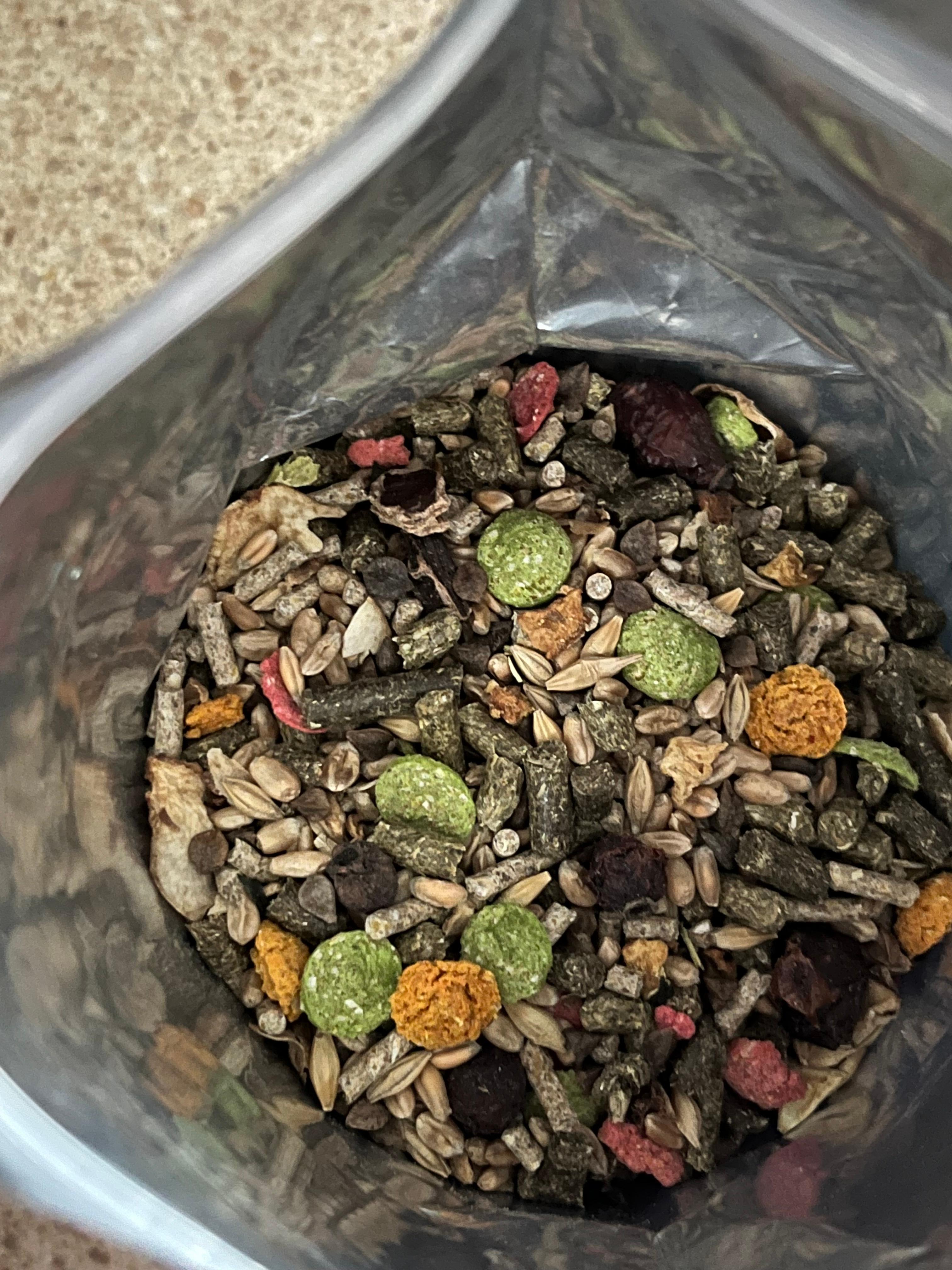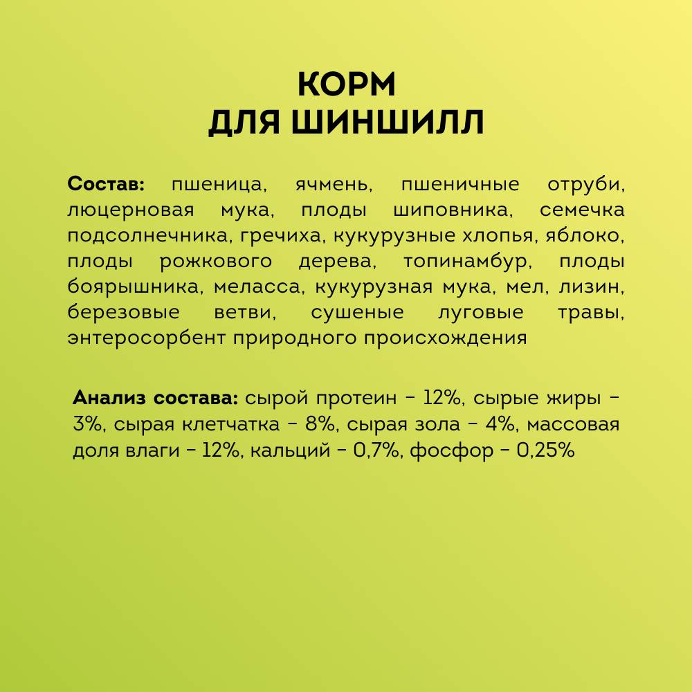 Корм разнообразный , без мусора. Шиншилла кушает с большим удовольствием.