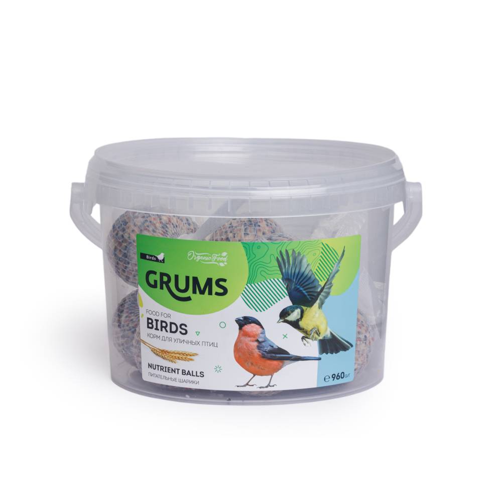 GRUMS Питательные шарики — это полноценное питание для уличных птиц. Изготовлены на основе животного жира с добавлением зёрен и семян. Животный жир, который составляет значительную часть шарика, является источником энергии, необходимой для поддержания температуры тела в холодное время года.