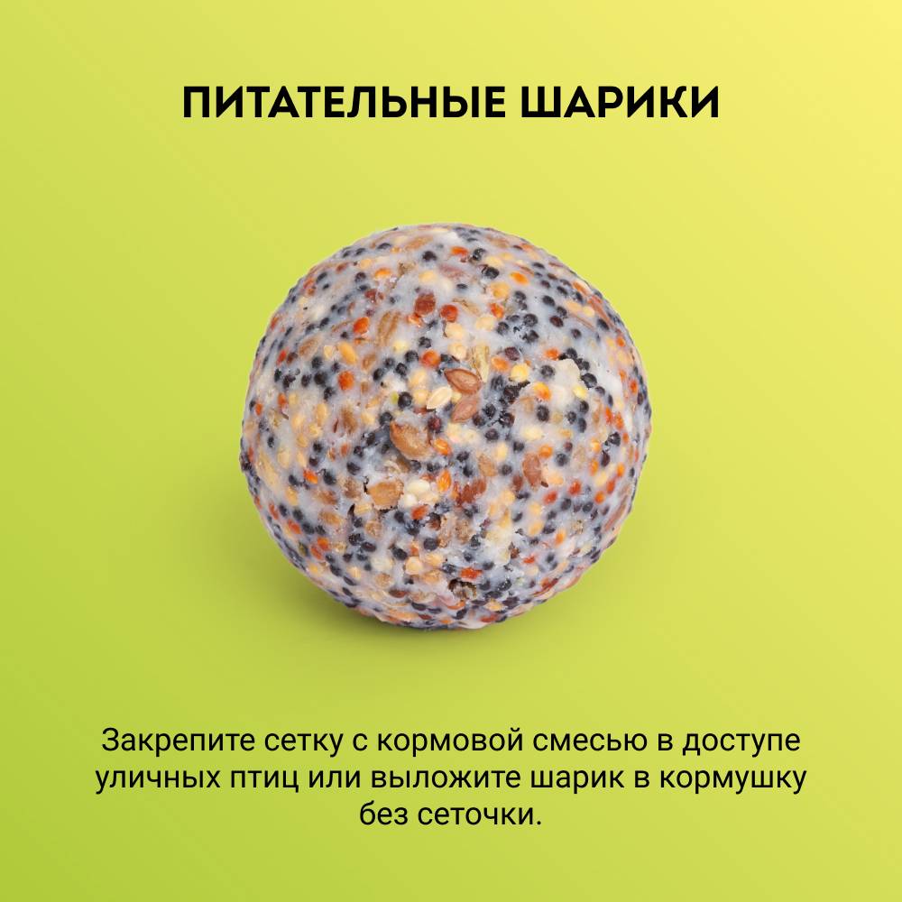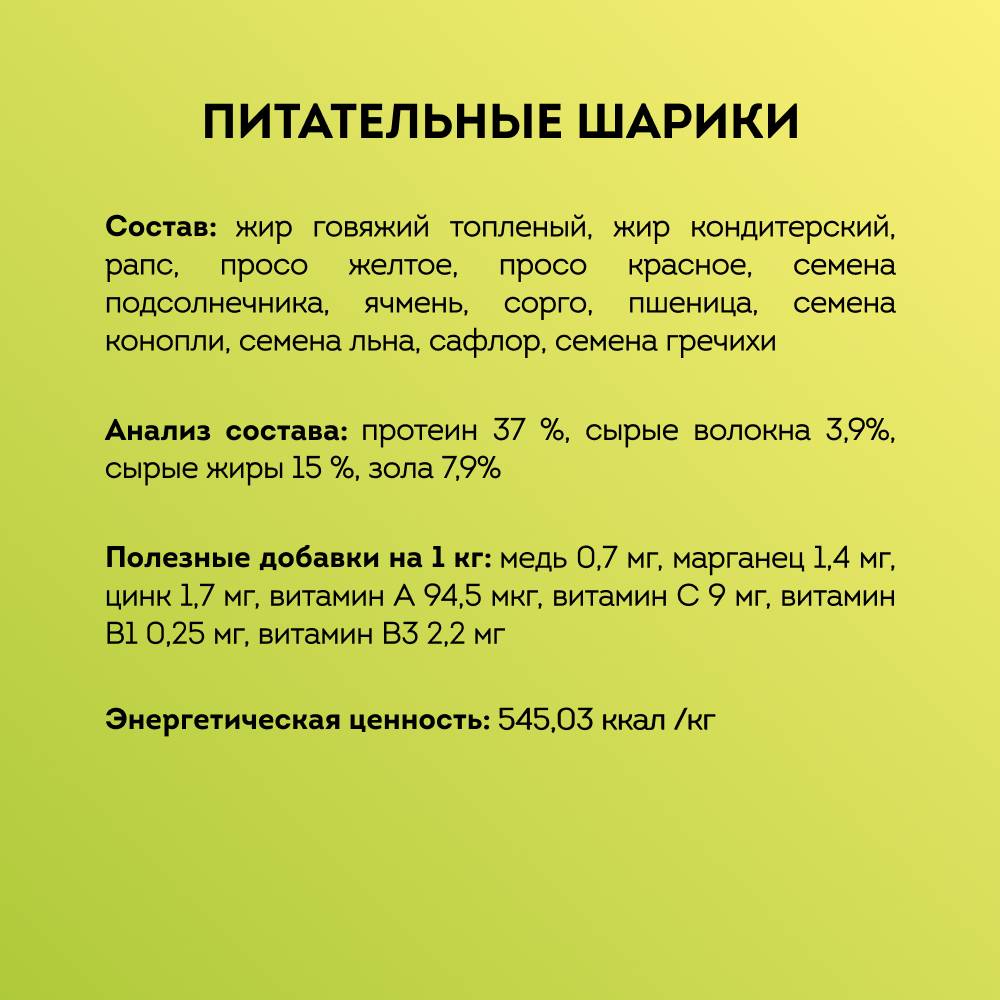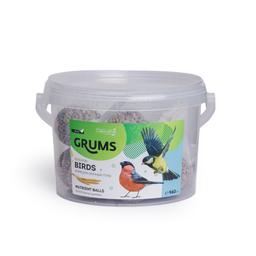 GRUMS Питательные шарики — это полноценное питание для уличных птиц. Изготовлены на основе животного жира с добавлением зёрен и семян. Животный жир, который составляет значительную часть шарика, является источником энергии, необходимой для поддержания температуры тела в холодное время года.