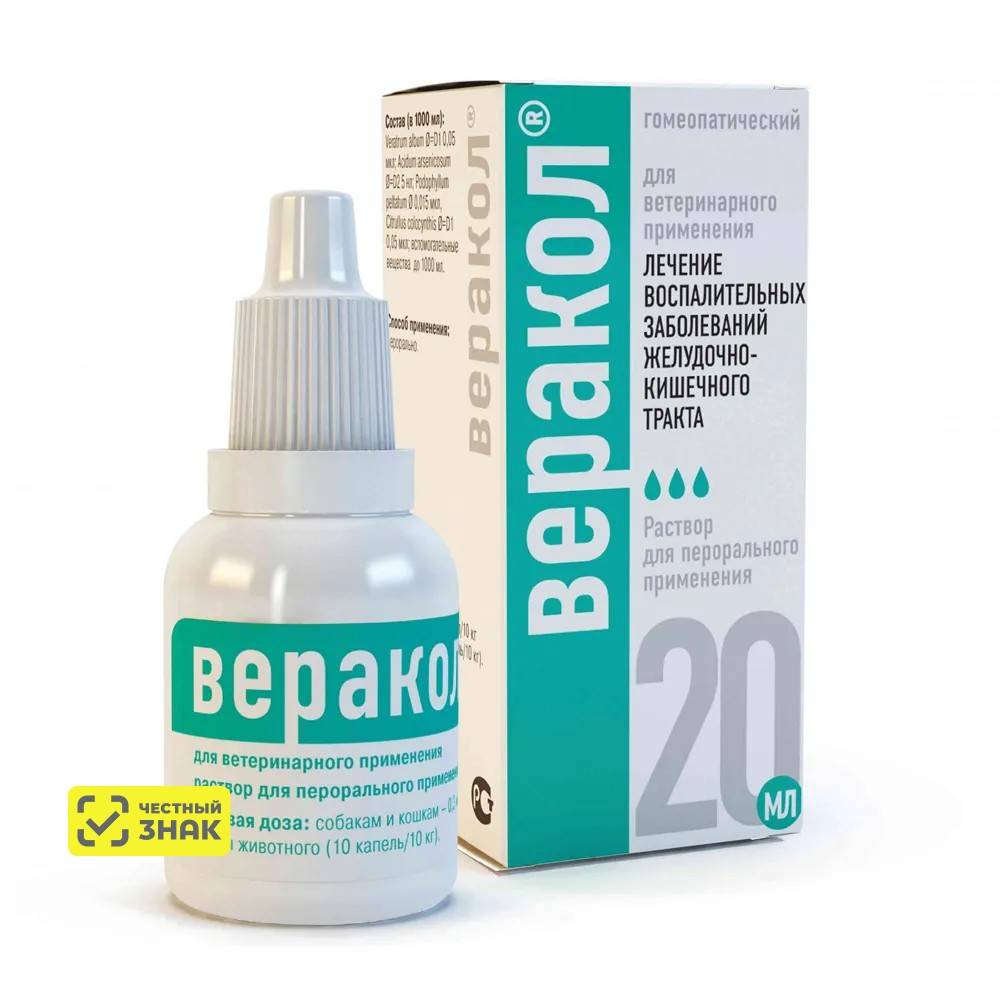 Гомеопатическое средство Веракол, благодаря натуральным компонентам оказывает мягкое противовоспалительное действие, регулирует моторику желудочно-кишечного тракта. Веракол по степени воздействия на организм теплокровных животных относится к малоопасным веществам, в рекомендуемых дозах не оказывает местнораздражающего, резорбтивно-токсического, мутагенного и сенсибилизирующего действия.
