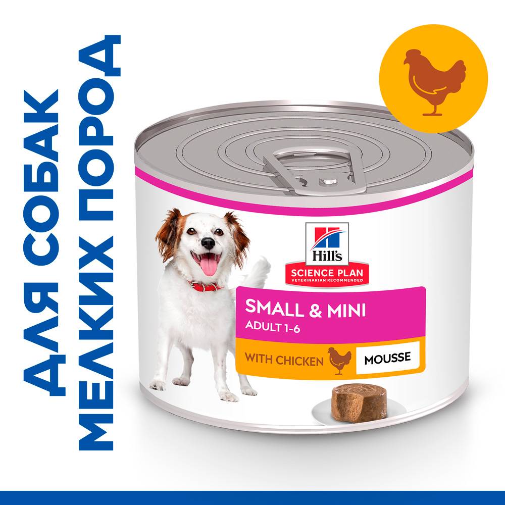 Влажный корм Hill's Science Plan Small Mini Мусс с курицей - полноценный рацион с мягкой текстурой для взрослых собак мелких пород в возрасте от 1 до 6 лет. Этот рацион разработан с учетом уникальных потребностей собак мелких пород в период расцвета их жизни. Мягкая муссовая текстура, обеспечивает вашего питомца необходимой энергией благодаря правильному сочетанию белков, жиров и углеводов.