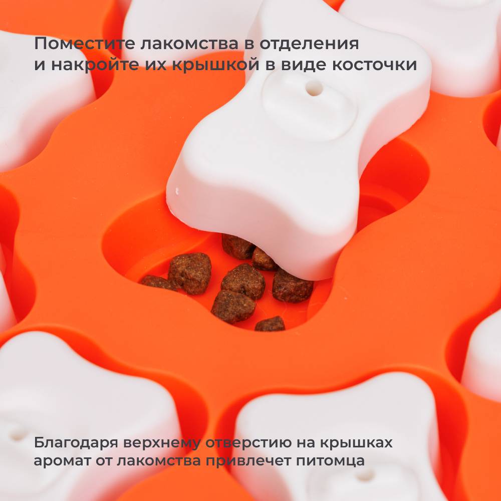 - Поместите лакомства в отделения и накройте их крышкой в виде косточки. Благодаря верхнему отверстию на крышках аромат от лакомства привлечет питомца.