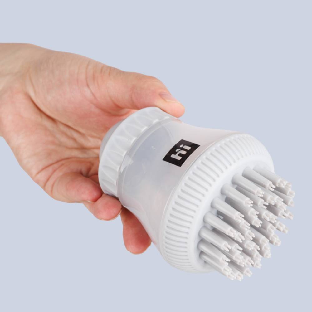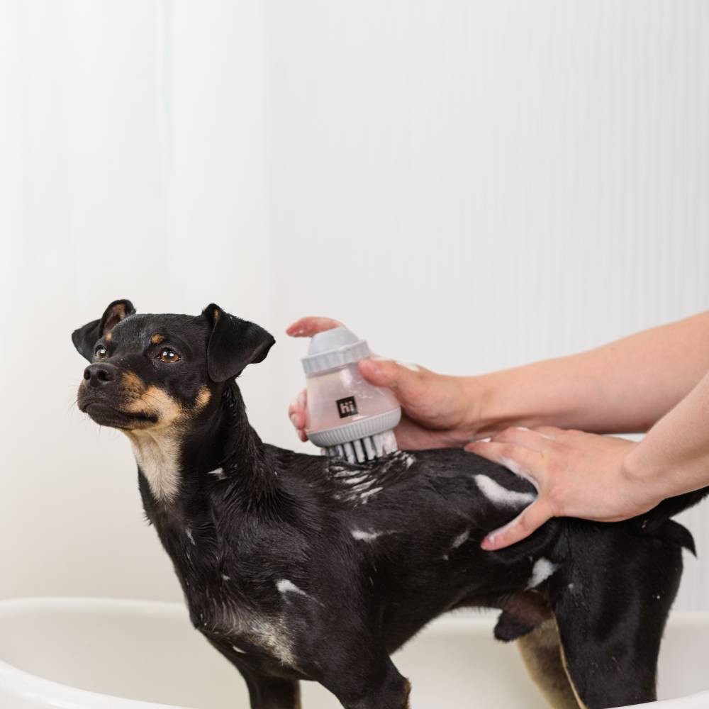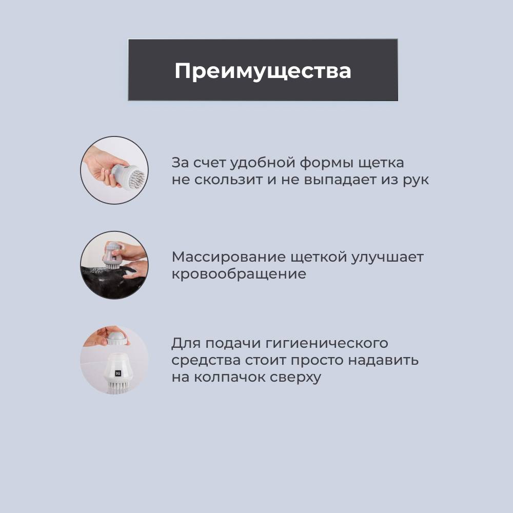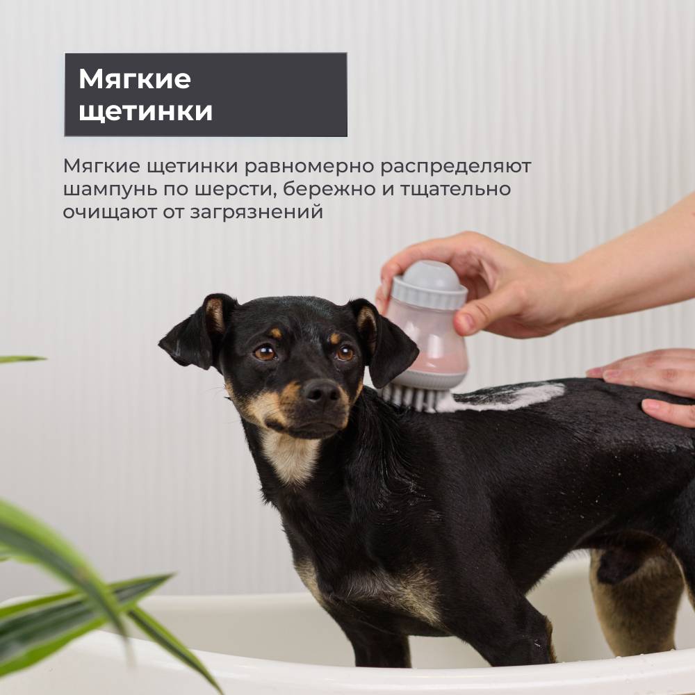 - Мягкие щетинки равномерно распределяют шампунь по шерсти, бережно и тщательно очищают от загрязнений.
