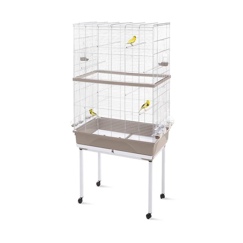 - Клетка располагается на подставке с колесиками, что делает её мобильной.