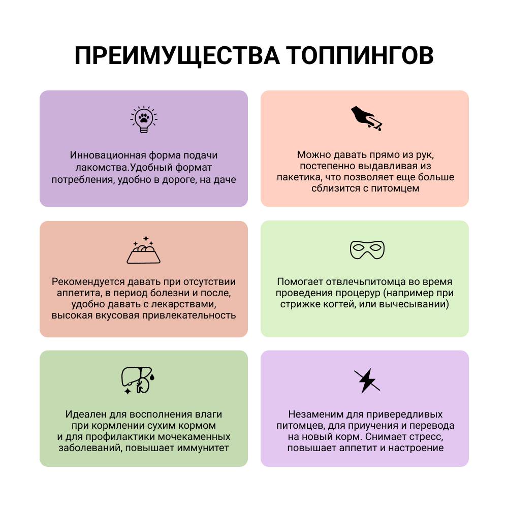 - Можно использовать в качестве топпинга к сухому и влажному корму