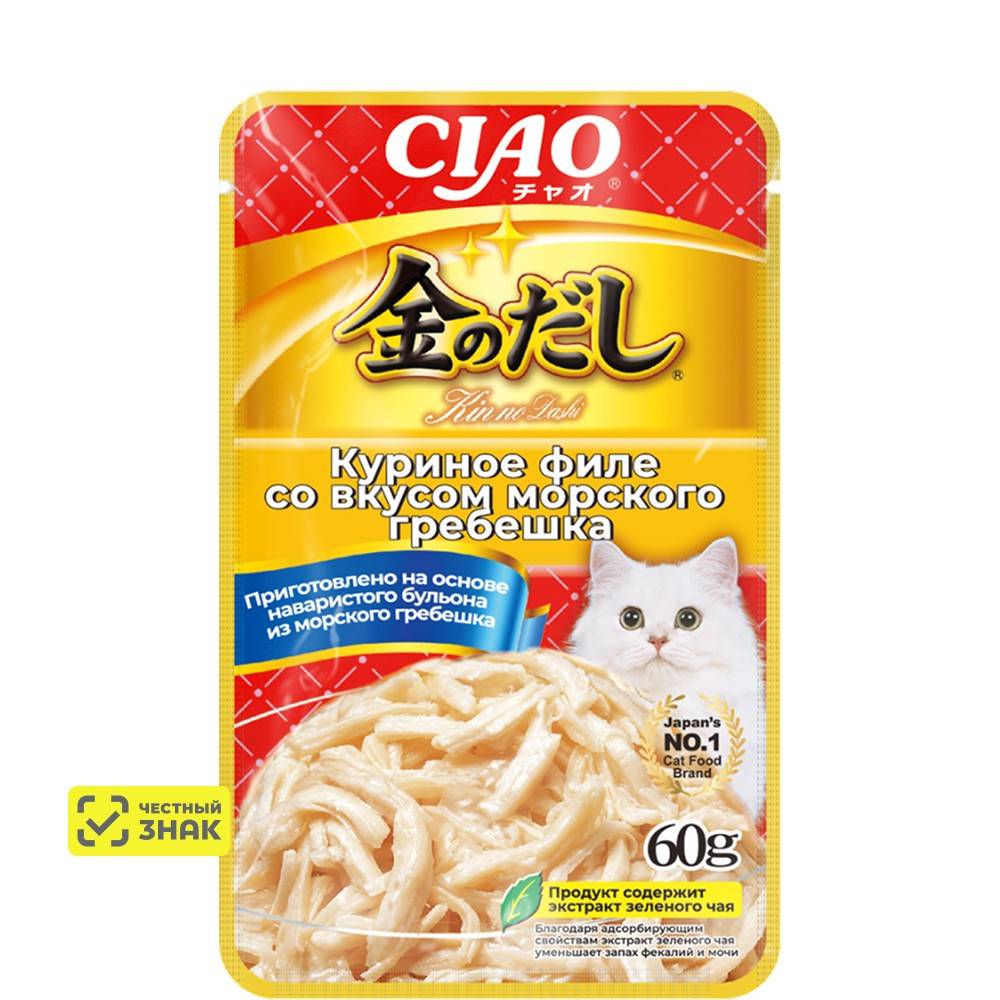 Влажный корм для кошек Inaba Ciao Kinnodashi в пауче приготовлен на основе кусочков мяса курицы с добавлением гребешка в аппетитном насыщенном бульоне золотистого цвета.