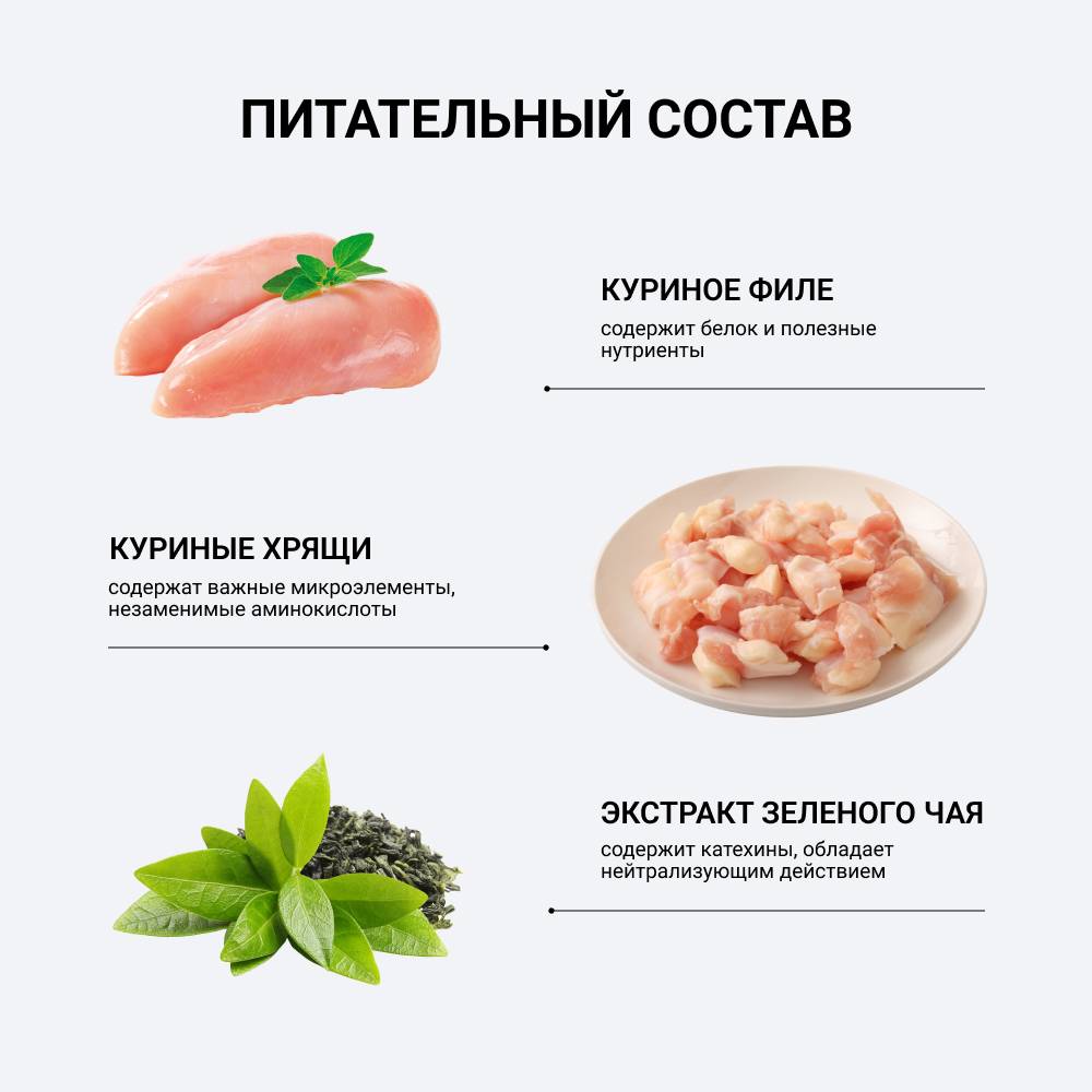 - В основе корма филе фермерской курицы.