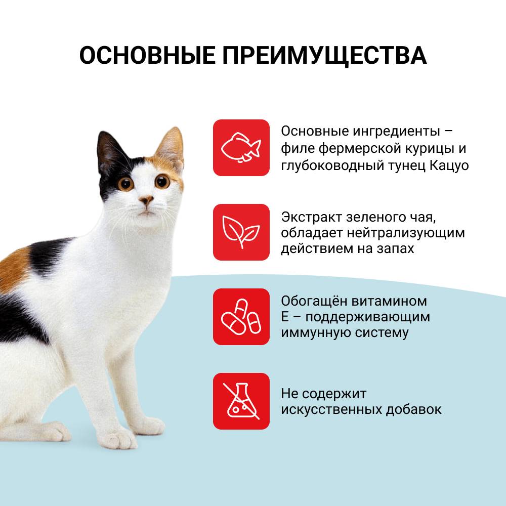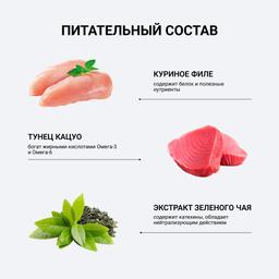 - Основные ингредиенты – филе фермерской курицы и глубоководный тунец Кацуо.