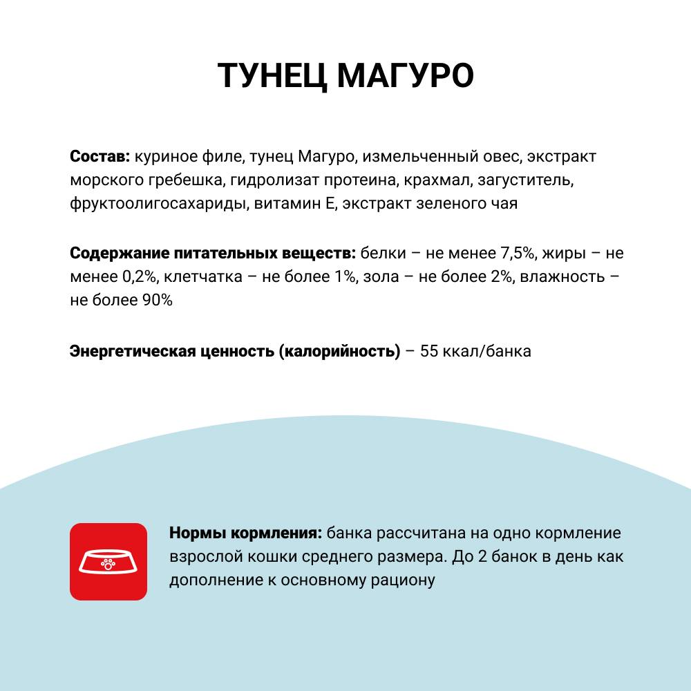 - Основные ингредиенты – филе фермерской курицы и глубоководный тунец Магуро.