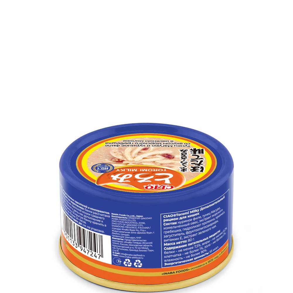 Inaba Ciao Toromi Milky - это суперпремиальный влажный корм для кошек, приготовленный на основе нежного куриного филе, глубоководного тунца Магуро со вкусом морского гребешка в овсяном молоке.