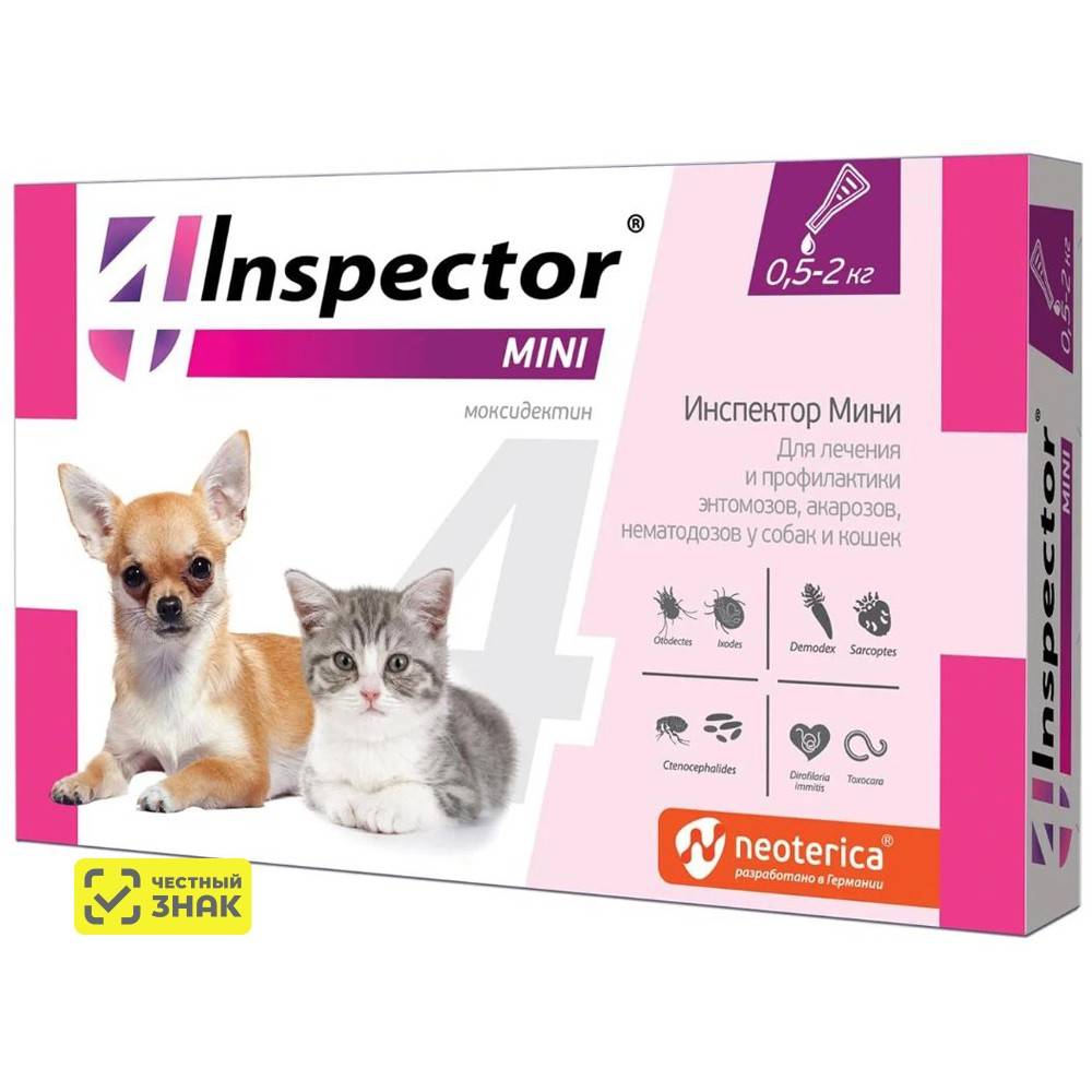 Защита от блох и клещей до 1-4 месяцев. Inspector Mini назначают котятам, щенкам, а также собакам и кошкам мелких пород для лечения и профилактики энтомозов (блохи, вши, власоеды), акарозов (иксодидозы, отодектоз, нотоэдроз, саркоптоз, демодекоз) и нематодозов желудочно-кишечного тракта (токсокароз, токсаскаридоз, унцинариоз, анкилостомоз, трихоцефалез), а также в целях профилактики дирофиляриоза.