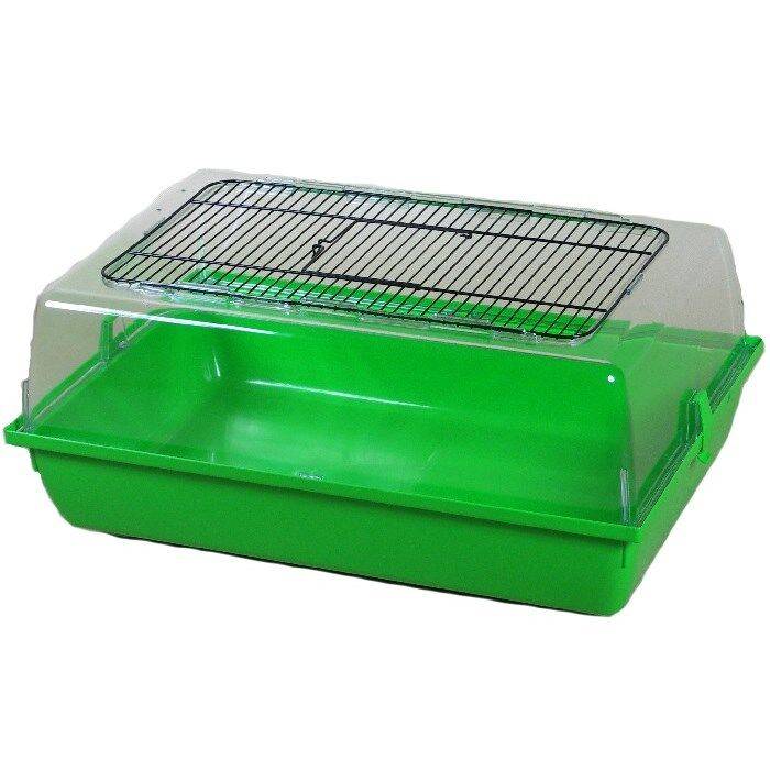 Клетка состоит из непрозрачного поддона, верхней прозрачной части и металлической решетки-входа сверху.
