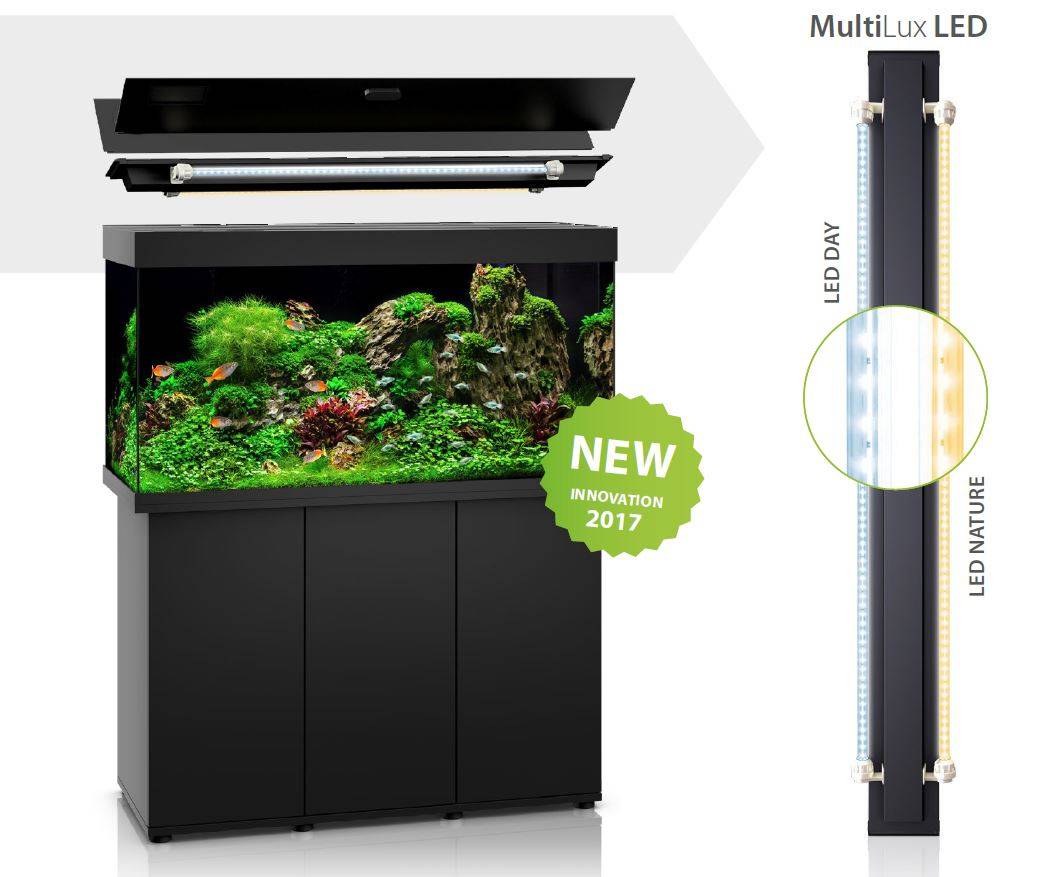 • Система освещения MultiLux LED аквариума RIO 180 LED позволяет удобно проводить работы в аквариуме даже при включенном освещении
