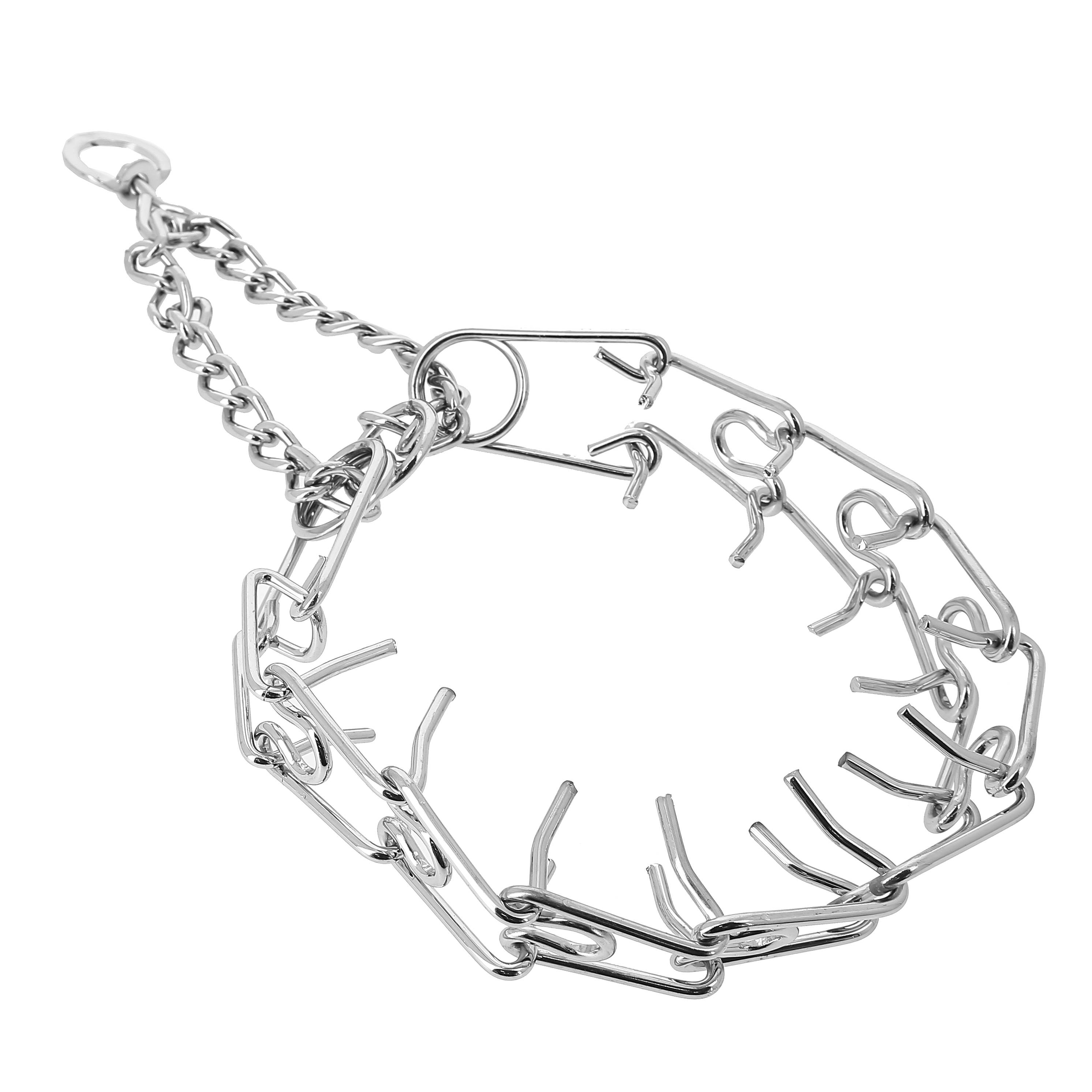- Этот строгий ошейник изготовлен из металлических нержавеющих звеньев, соединённых между собой в конструкцию в форме гибкой металлической цепочки из 9-ти съемных звеньев с шипами на внутренней стороне.