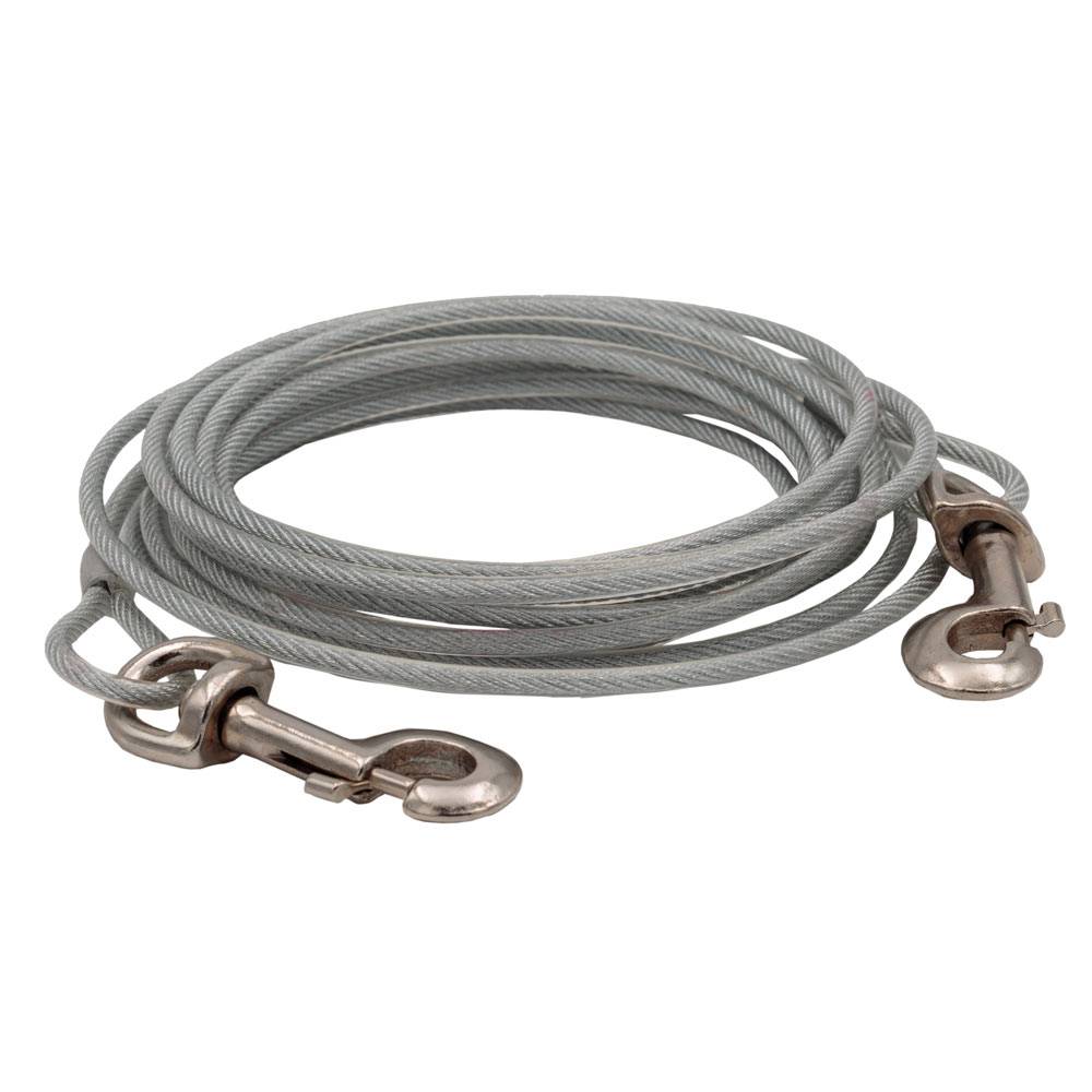 Трос привязочный Ø 5 мм длина 10 м Крепкий, надёжный металлический трос в пластиковой обмотке прослужит вам много лет. Он предназначается для ограничения передвижения собаки на определенной территории. Привязочный трос оснащён двумя стальными карабинами.