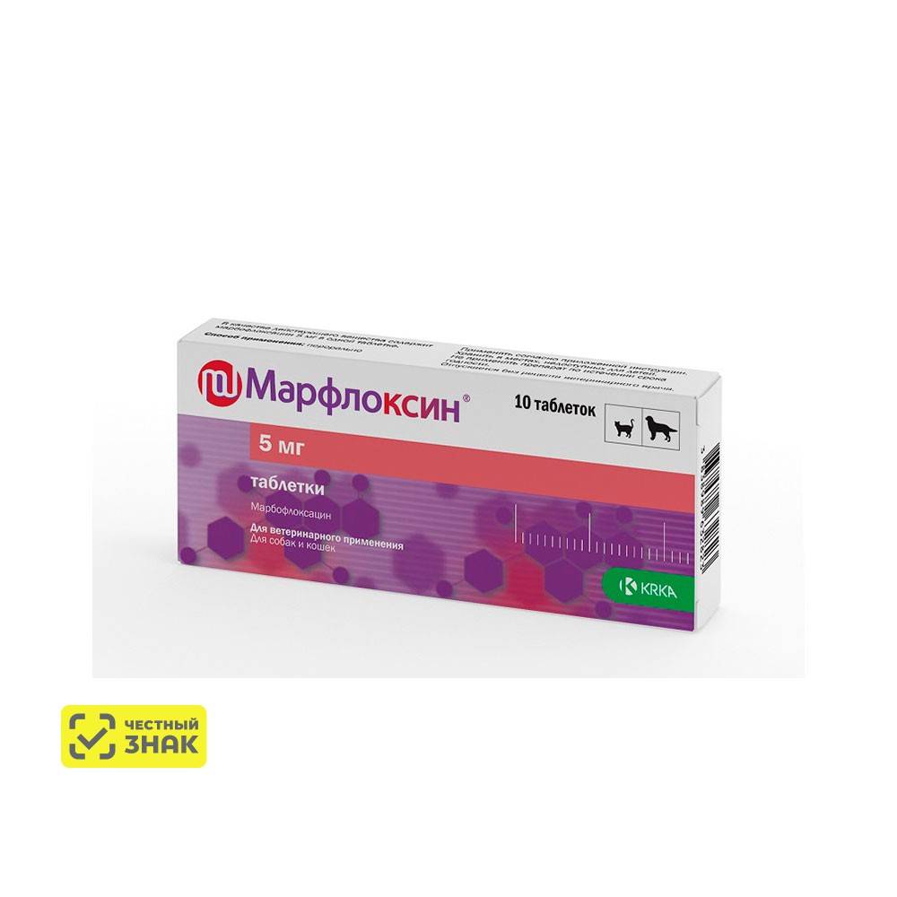 Препарат обладает широким спектром бактерицидного действия, основанного на подавлении бактериальных ферментов ДНК- гиразы и топоизомеразы IV, участвующих в репликации ДНК микроорганизмов. Марбофлоксацин, действующее вещество Марфлоксина® таблеток, активен в отношении грамположительных и грамотрицательных микроорганизмов, в т.ч. Escherichia coli, Salmonella typhimurium, Citrobacter freundii, Enterobacter cloacae, Serratia marcescens, Morganella morganii, Proteus spp, Klebsiella spp. Shigella spp, Pasteurella spp, Haemophilus spp, Moraxella spp, Pseudomonas spp, Brucella canis, Staphylococci, Streptococci, а также Mycoplasma spp.