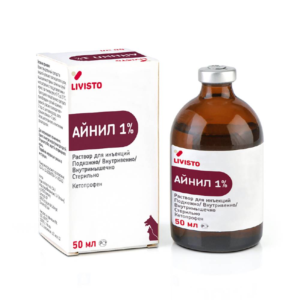 Айнил 1% для лечения заболеваний опорно-двигательного аппарата и в качестве обезболивающего и жаропонижающего средства у собак и кошек.