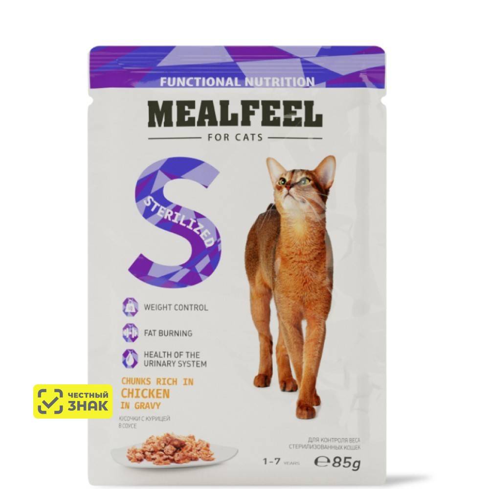Mealfeel Functional Nutrition для кастрированных и стерилизованных кошек курица в соусе с цельными кусочками филе для контроля веса — это полноценный сбалансированный рацион, созданный специально для поддержания идеального веса. Формула пищевых компонентов корма оказывает эффективный контроль веса питомца, сжигая жиры и поддерживая здоровье мочевыделительной системы.