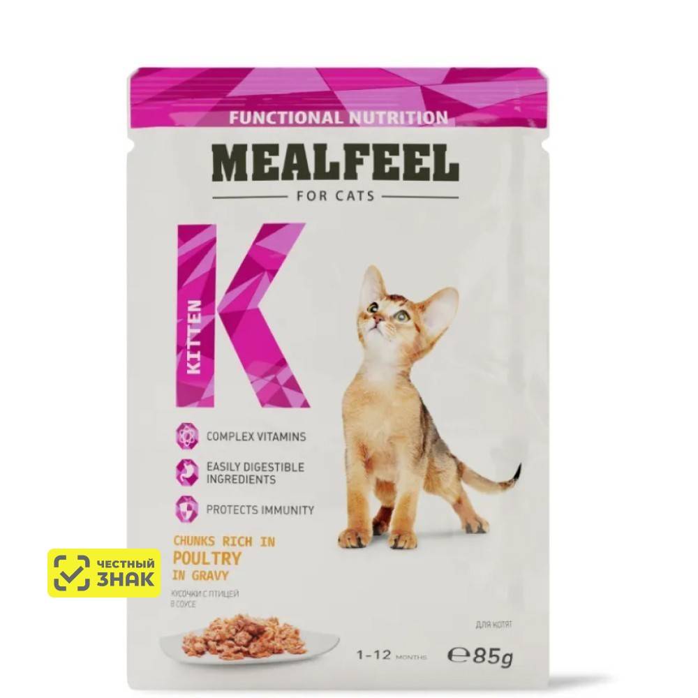 Mealfeel Functional Nutrition для котят Кусочки с домашней птицей в соусе — это полнорационное сбалансированное питание, предназначенное специально для самых юных домашних питомцев. Формула корма идеально сбалансирована таким образом, чтобы обеспечить растущий организм котёнка всеми необходимыми питательными веществами, минералами и витаминами.