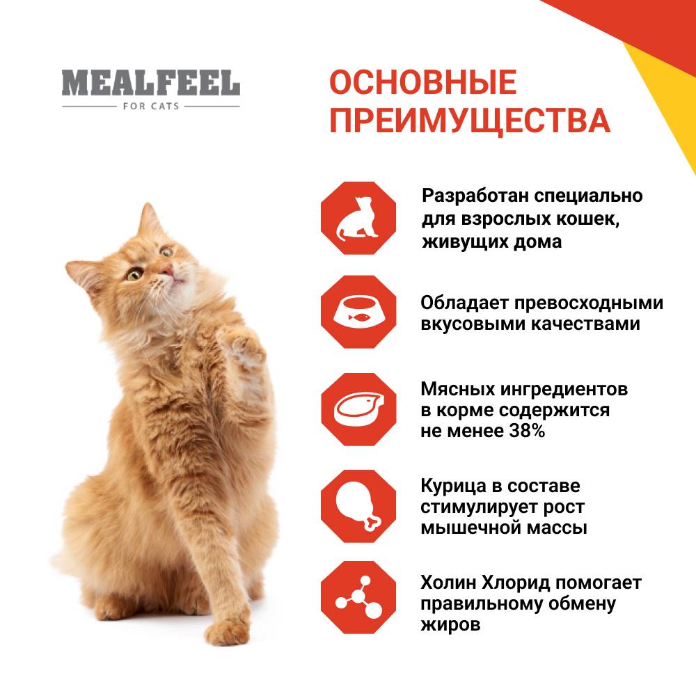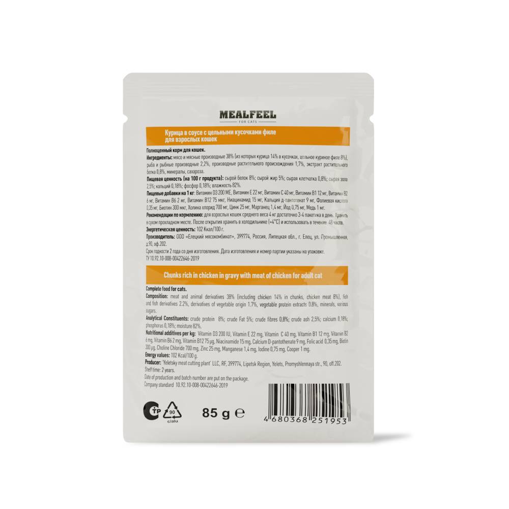 Mealfeel для взрослых кошек курица в соусе с цельными кусочками филе полноценный сбалансированный рацион для вашего питомца.Благодаря содержанию необходимых питательных веществ, витаминов и минералов, рацион способствует поддержанию здоровья взрослой кошки. Корм обладает превосходными вкусовыми качествами и понравится любой, даже самому привередливому домашнему любимцу.