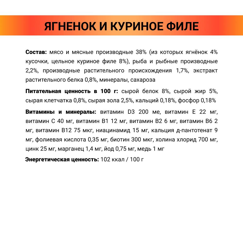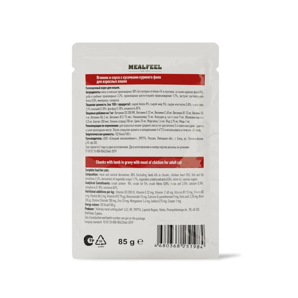 Mealfeel для взрослых кошек Ягненок в соусе с кусочками куриного филе– это полноценный сбалансированный рацион в виде кусочков в соусе, разработанный для взрослых кошек. Благодаря содержанию необходимых питательных веществ, витаминов и минералов, рацион способствует поддержанию здоровья взрослой кошки. Корм обладает превосходными вкусовыми качествами и понравится любой, даже самой привередливой кошке.