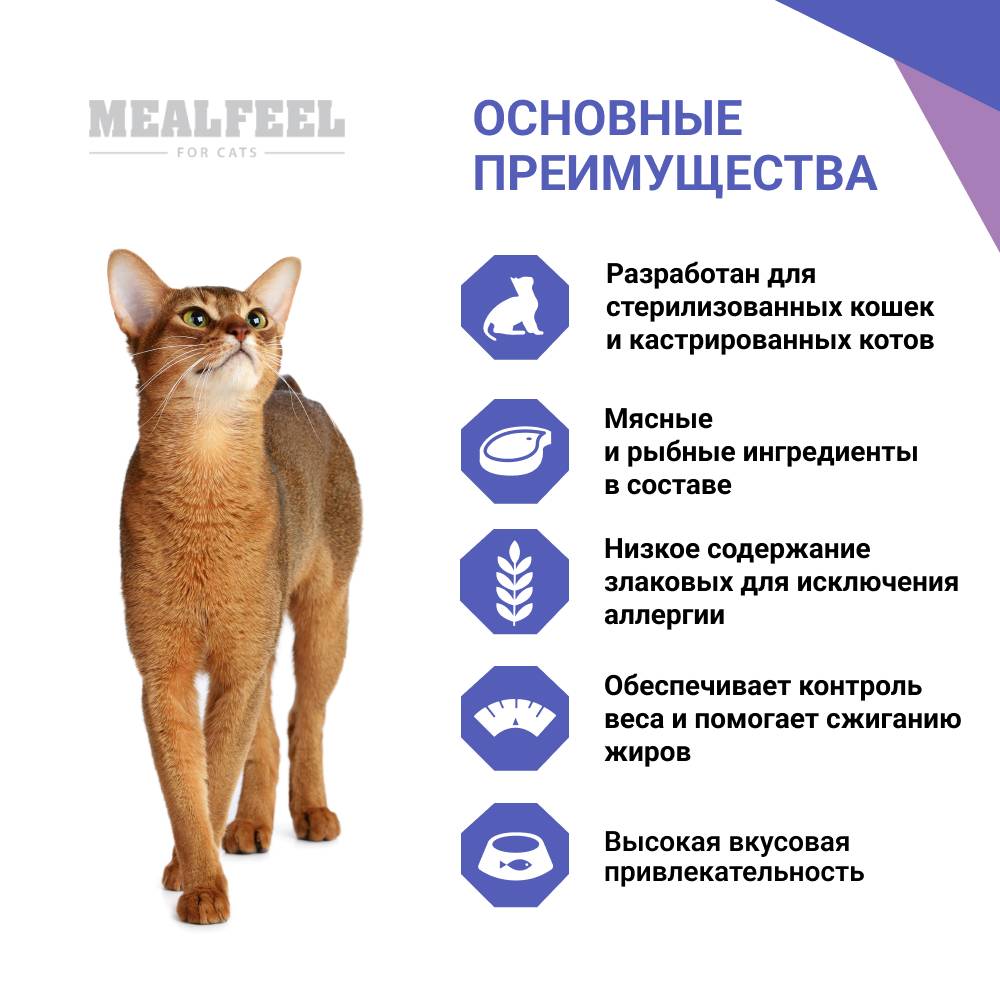 MEALFEEL STERILIZED – сухой рацион на основе свежего мяса, разработанный специально для стерилизованных кошек и кастрированных котов.