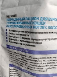 - Сбалансированное количество белков, жиров, углеводов и пищевых добавок обеспечивает контроль веса, L-карнитин помогает сжиганию жиров. Это особенно важно для стерилизованных кошек, так как они более остальных подвержены набору лишнего веса.