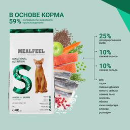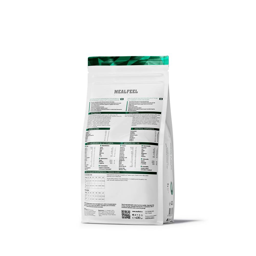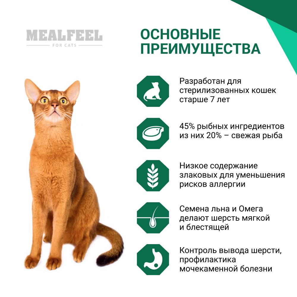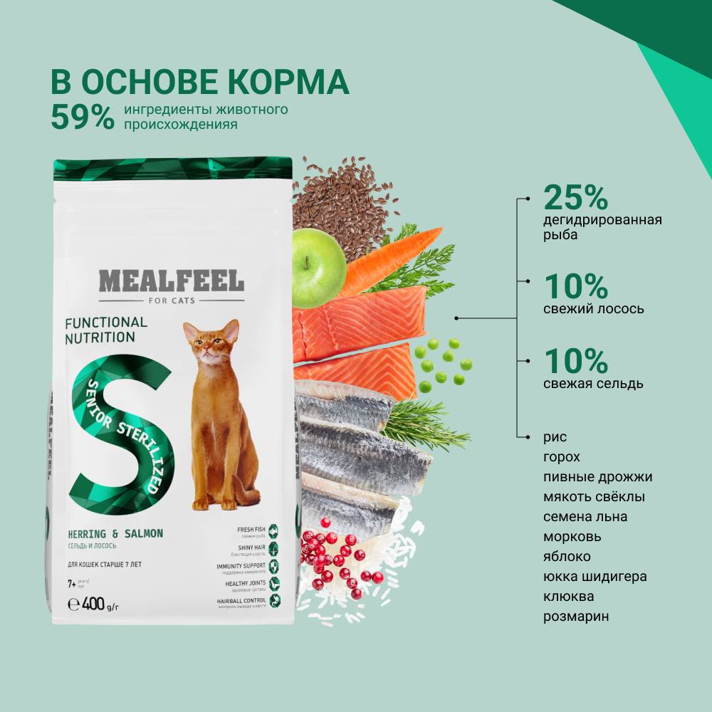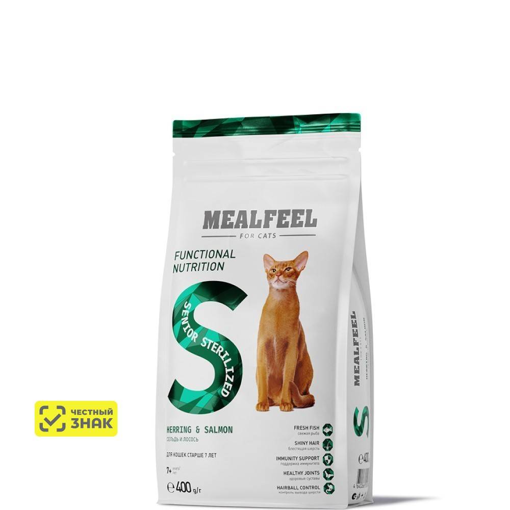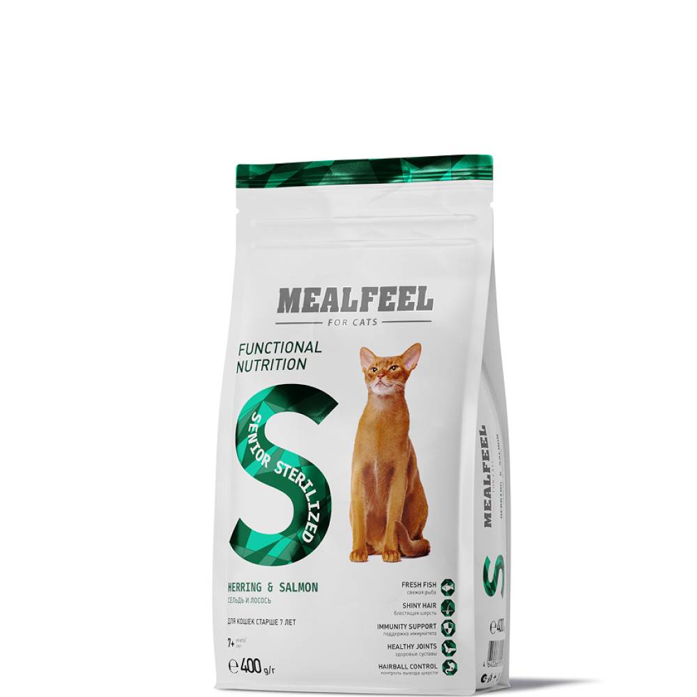 Mealfeel Senior Sterilized– корм, разработанный специально для стерилизованных кошек старше 7 лет. Поддерживает здоровье стерилизованных и кастрированных питомцев, оказывая профилактику мочекаменной болезни. Особая формула помогает бороться с проблемами взрослых кошек – улучшает состояние и внешний вид шерсти, а также способствует контролю веса на фоне уменьшающейся активности.