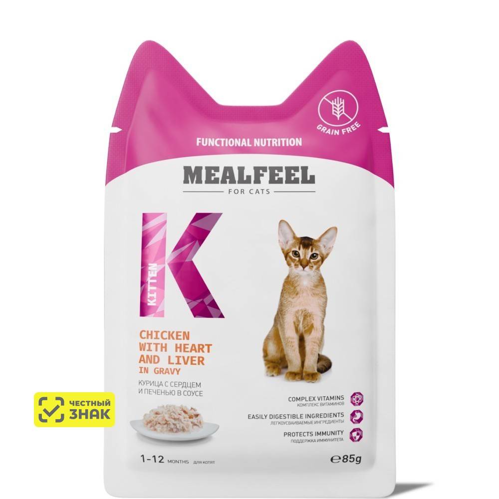 Mealfeel с курицей, печенью и сердцем в соусе – полнорационный влажный корм для котят. Сочные кусочки в нежном соусе обладают изысканным вкусом и содержат комплекс полезных веществ для роста и развития.