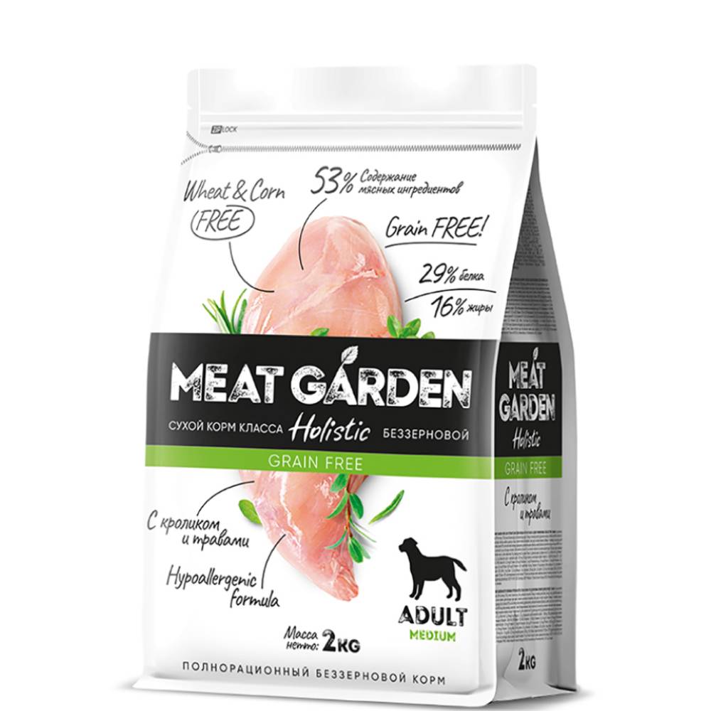 Сухой полнорационный беззерновой корм для взрослых собак средних пород с кроликом и травами.