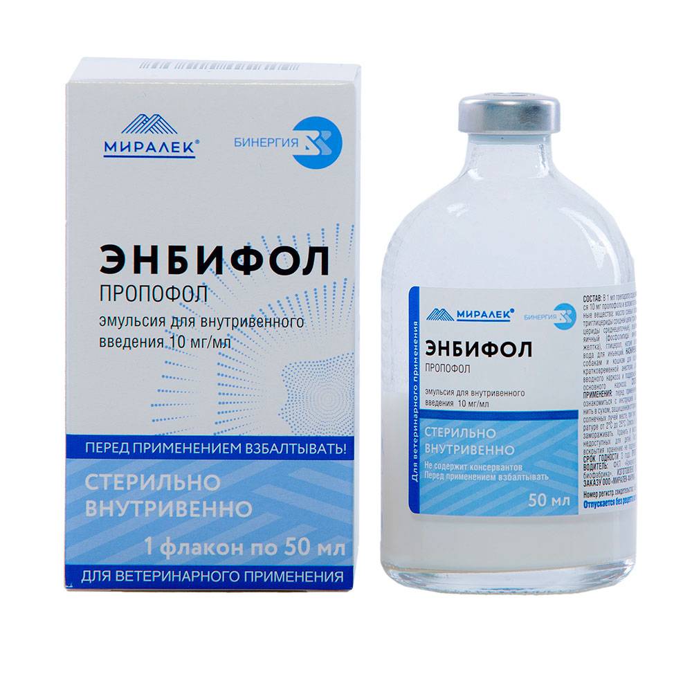 «Энбифол» применяют кошкам и собакам для общей кратковременной анестезии (особенно когда требуется короткий период выхода животного из наркоза), для вводного наркоза и поддержания наркоза. Пропофол, входящий в состав препарата, обладает высокой липофильностью и легко проникает через гематоэнцефалический барьер, вызывает быстрый кратковременный анестезирующий эффект с минимальным проявлением стадии возбуждения. Медикаментозный сон наступает в период до 60 секунд и длится от 10 до 60 минут – в зависимости от введенной дозы.