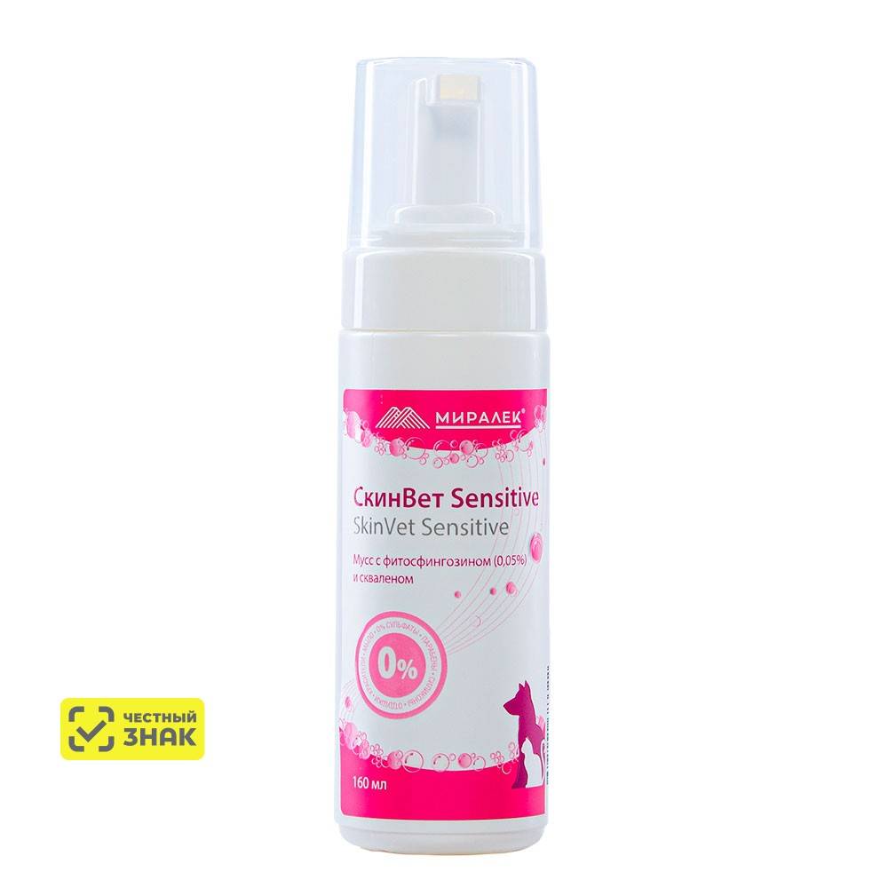 «Мусс Скинвет Sensitive» со скваленом и фитосфингозином применяется для лечебного ухода и профилактического ухода за кожей животного, может применяться в качестве очищающего средства, смягчает кожу и шерсть животного. Сквален и фитосфингозин в составе мусса способствуют удержанию влаги и восстановлению липидного барьера в коже, оказывают противовоспалительное действие.