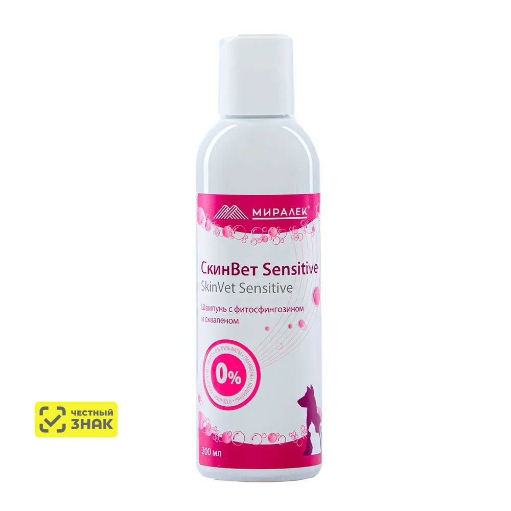 «Шампунь Скинвет Sensitive» со скваленом и фитосфингозином смягчает кожу и шерсть животного, способствуя удержанию влаги и восстановлению липидного барьера в коже. Также компоненты шампуня позволяют устранить повреждения и ломкость волос и укрепить волосяные луковицы.