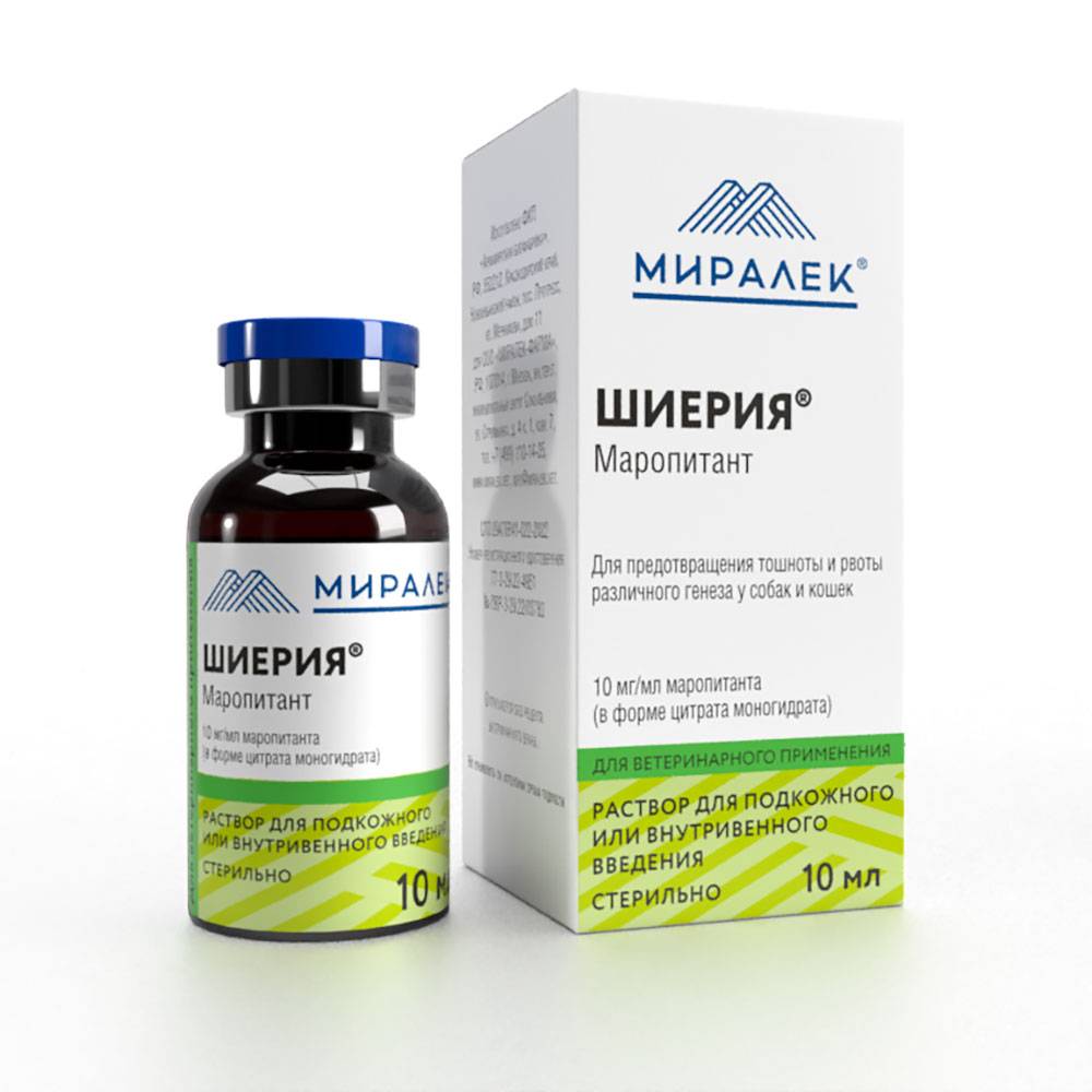 «Шиерия®» применяется кошкам и собакам для предотвращения тошноты и рвоты различного генеза, в том числе при парвовирусном энтерите, а также вызванных применением средств для химиотерапии или транспортировкой животного (синдром укачивания). Маропитант цитрат моногидрат, входящий в состав препарата, эффективен в предотвращении рвоты как центрального, так и периферического генеза, способствует улучшению восстановления после анестезии, вызванной применением агонистов μ-опиатных рецепторов